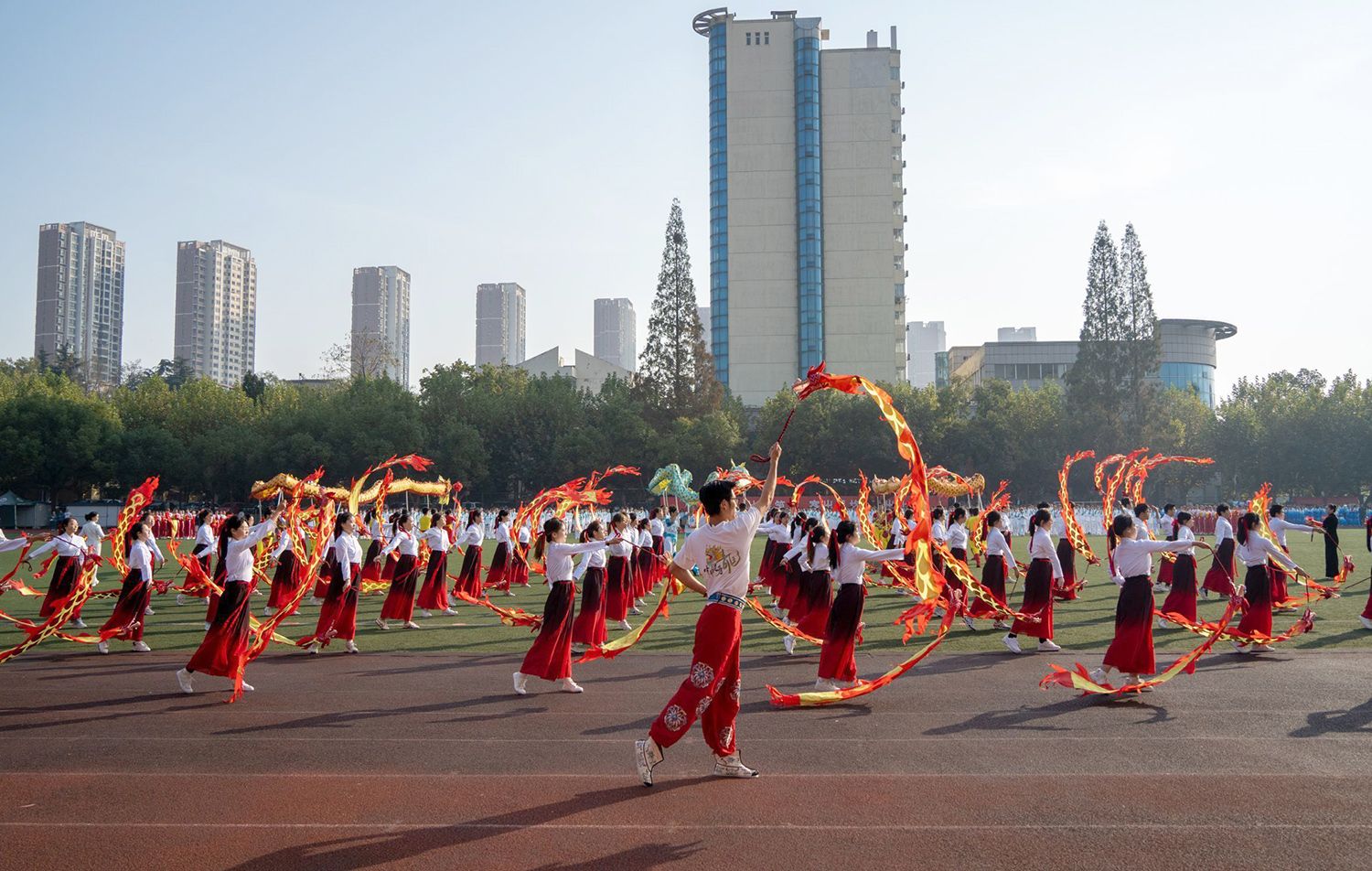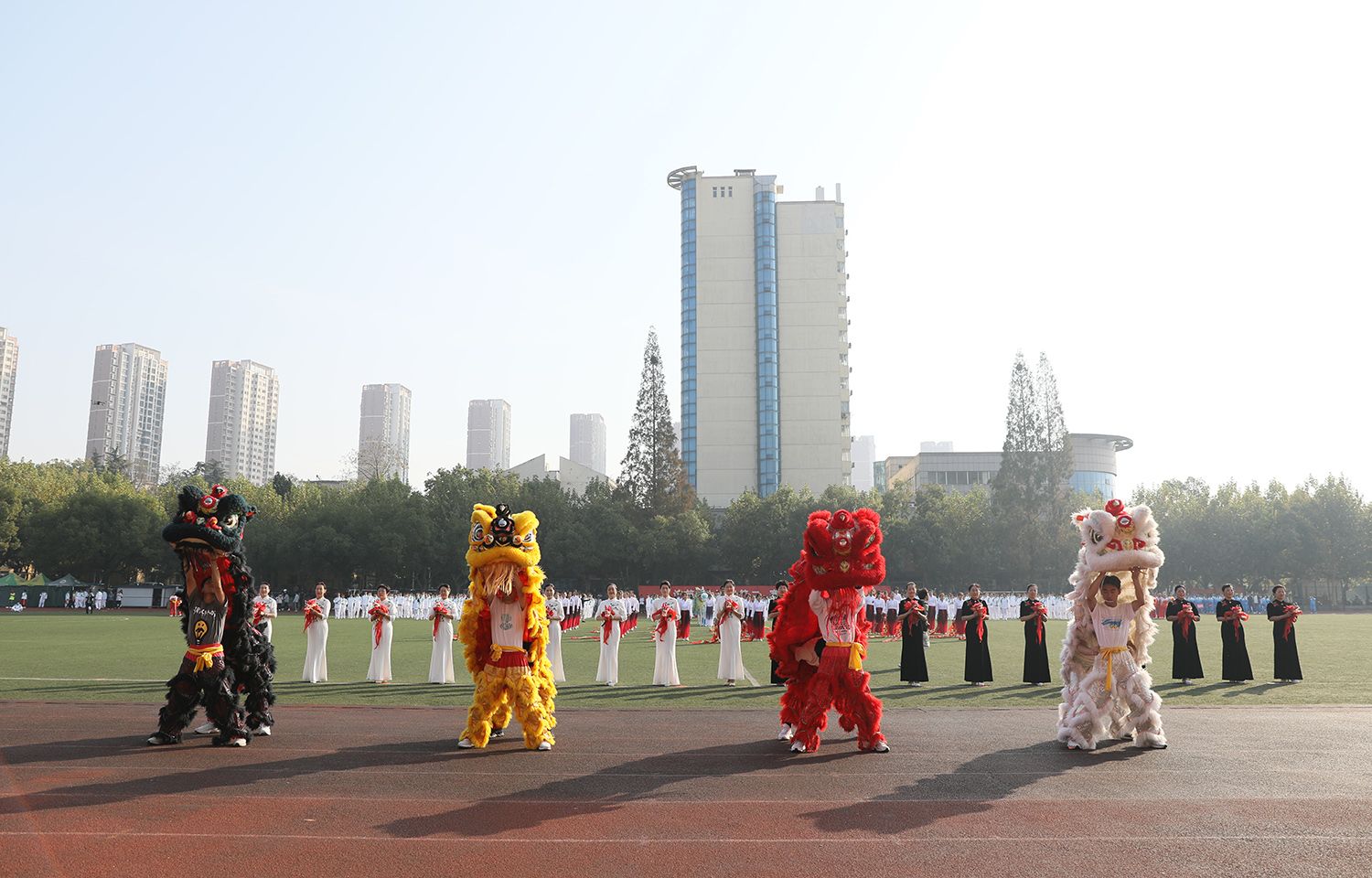 张济建宣布beat365英国官网网站第二十二届运动会开幕。开幕式上,学生进行了舞龙舞狮、排舞表演,教职工进行了太极扇等表演。