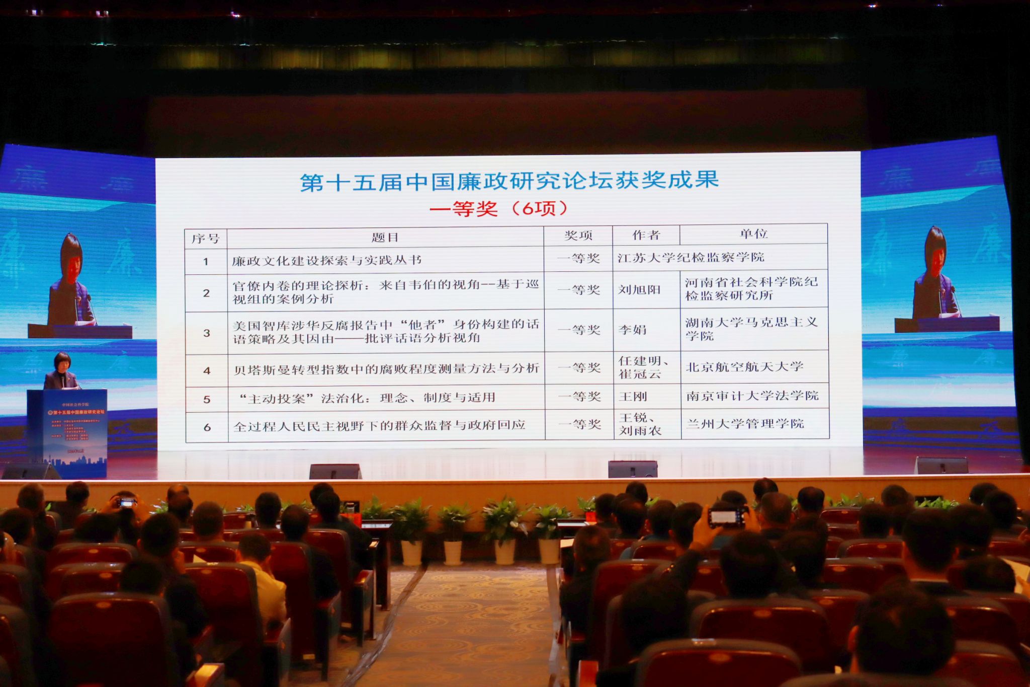 围绕“国家治理现代化与纪检监察学学科发展”主题,本次论坛共收集研究成果355项,评选出39项优秀成果。中国社会科学院直属机关党委常务副书记、中国廉政研究中心常务理事王晓霞宣布论坛获奖名单。beat365英国官网网站纪检监察学院《廉政文化建设探索与实践丛书》等6项优秀成果获第十五届中国廉政研究论坛优秀成果一等奖。