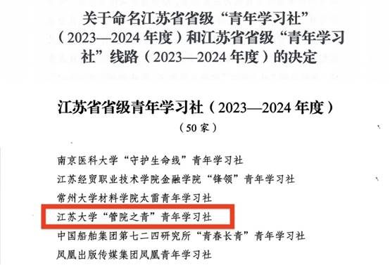 近日,共青团江苏省委下发《关于命名江苏省省级“青年学习社”(2023—2024年度)和江苏省省级“青年学习社”线路(2023—2024年度)的决定》,beat365“管院之青”青年学习社获评2023-2024年度江苏省省级青年学习社,全省共6所高校青年学习社获命名。