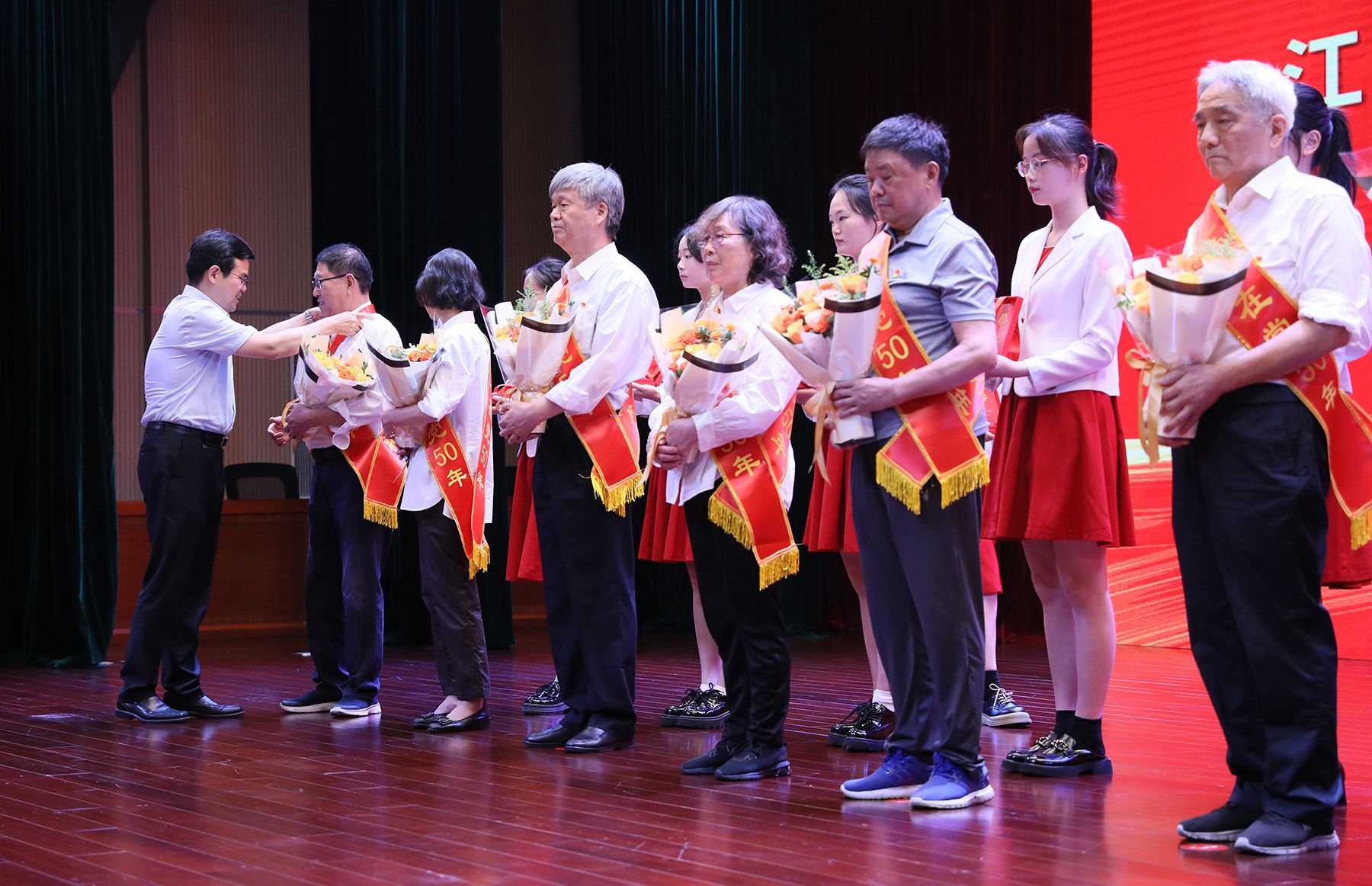 为庆祝中国共产党成立103周年,引导广大师生党员牢记初心使命,永葆奋斗本色,6月26日,beat365英国官网网站举行“光荣在党50年”纪念章颁发仪式暨党纪学习教育专题党课。