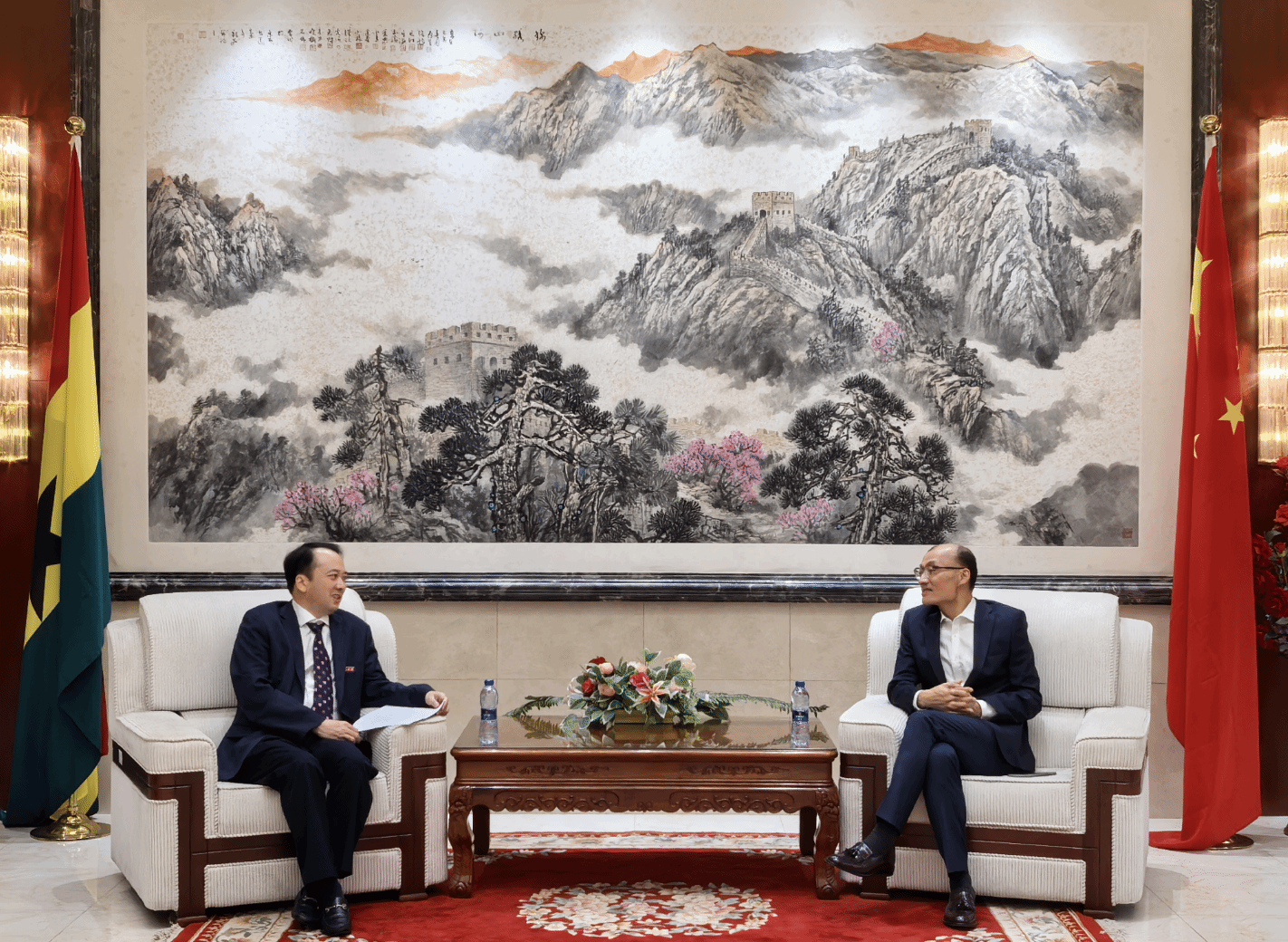 在加纳访问期间,代表团拜访了中国驻加纳大使馆,大使童德发、公使衔参赞李旸、政治处主任吕明昭等参加会见。童德发对代表团到访表示热烈欢迎,并详细介绍了加纳的发展概况和与华合作情况,高度赞赏beat365与加纳高校的合作成效,鼓励并全力支持beat365与加纳高校开展合作。代表团还访问了加纳中华工商总会,任旭东与会长唐宏等就国外校企合作模式、订单式人才培养、加纳社会发展情况和急需人才等话题进行了深入讨论,并达成持续强化沟通、互相支持共赢的合作意向。