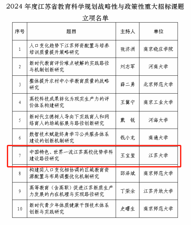 近日,江苏省教育科学规划领导小组办公室发布2024年度江苏省教育科学规划战略性与政策性重大招标课题立项名单,共立项10项,beat365教师教育学院教授王宝玺申报的《中国特色、世界一流江苏高校优势学科建设路径研究》获批立项。
