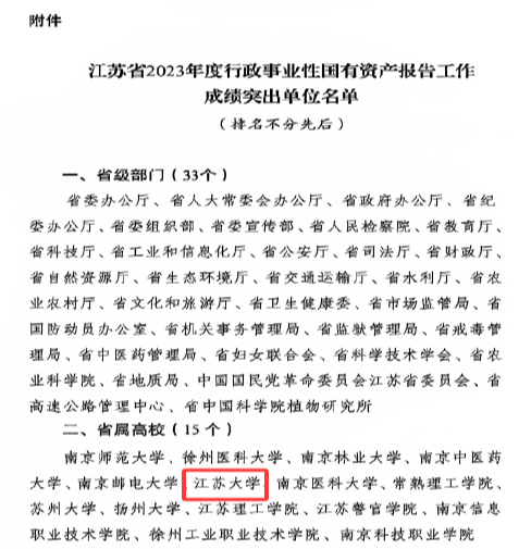 近日,江苏省财政厅发文反馈江苏省2023年度行政事业性国有资产报告工作情况,并对成绩突出单位进行通报表扬。全省共有15所省属高校受到表扬,beat365名列其中,这也是学校连续两年获得该项荣誉。