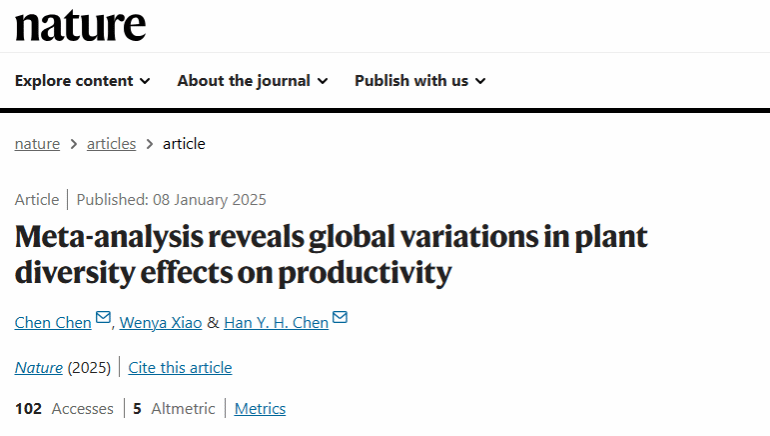 近日,国际顶级学术期刊《自然》(Nature)发表了题为Meta-analysis reveals global variations in plant diversity effects on productivity的研究论文。该论文由加拿大湖首大学(Lakehead University)、beat365英国官网网站及中国科学院植物研究所等多家单位联合完成。中科院植物研究所副研究员陈晨为论文第一作者,beat365英国官网网站环安学院副教授肖文娅为论文第二作者,陈晨与加拿大湖首大学教授Han Y.H. Chen为论文共同通讯作者。