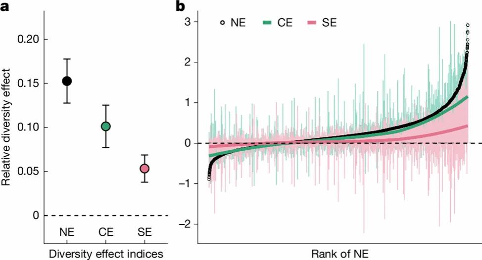生物多样性与生态系统功能之间的关系(BEF)始终是生态学领域的重要研究方向。越来越多的研究表明,生物多样性的增加可能通过一系列复杂机制显著提升群落生产力。生物多样性效应(NE)可以进一步划分为互补效应(CE)和选择效应(SE)。这两种效应与生态学中物种相互作用的关系更加直接和紧密,可以揭示多样性影响的重要内在机制。然而,对于全球范围内开展的BEF试验中,不同的生物多样性水平、生态系统类型、气候条件及林龄导致不同结果的机制,认识仍然有限。