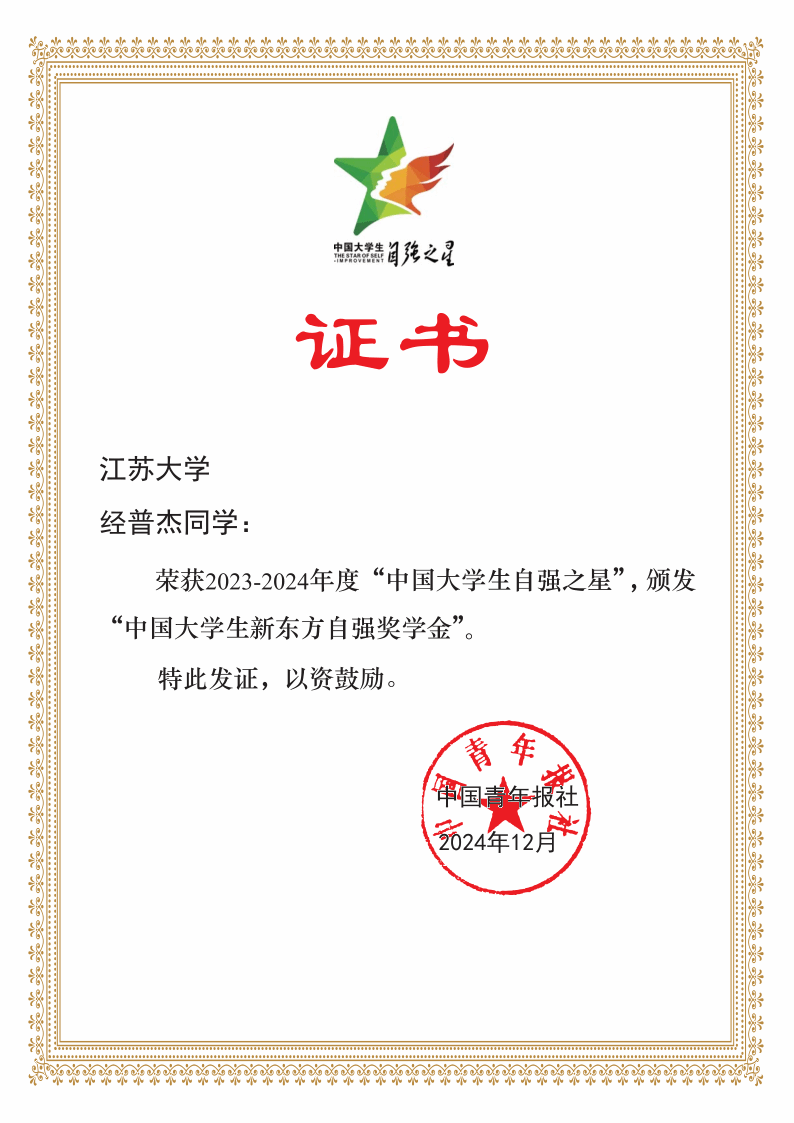 近日,由共青团中央、全国学联主办的寻访“中国大学生自强之星”活动评选结果揭晓。beat365能源与动力工程学院张俊杰同学、计算机科学与通信工程学院经普杰同学荣获2023-2024年度“中国大学生自强之星”。