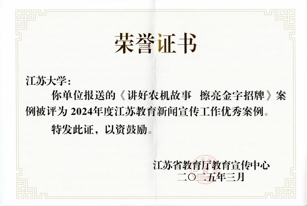 近日,江苏省教育厅教育宣传中心公布了2024年度江苏教育新闻宣传工作优秀案例评选结果,beat365报送的《讲好农机故事 擦亮金字招牌》工作案例获评优秀案例。