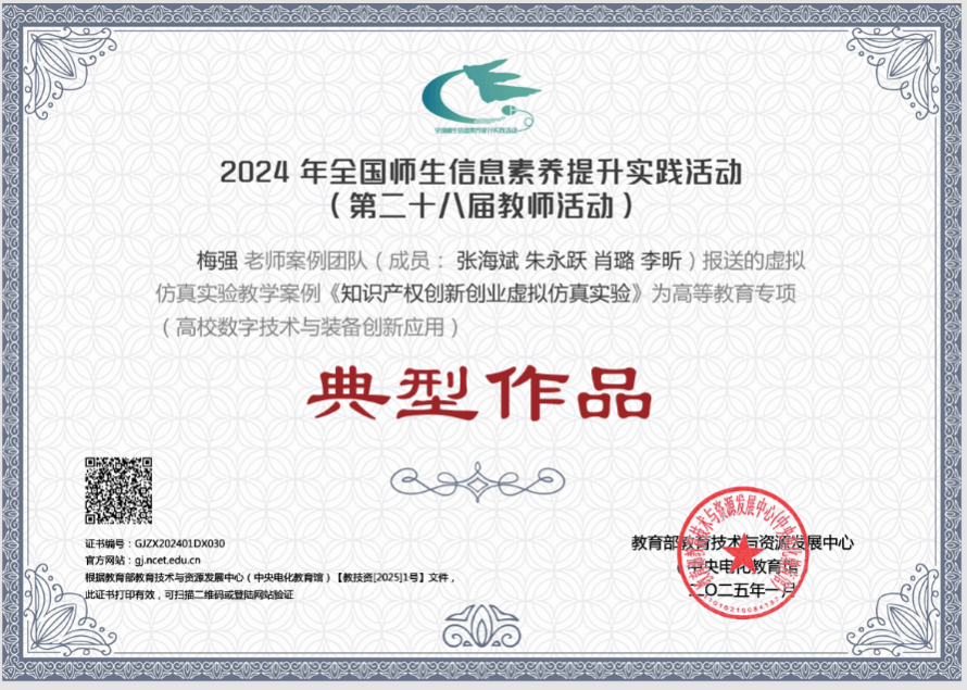 近日,在教育部教育技术与资源发展中心(中央电化教育馆)2024年全国师生信息素养提升实践活动(第二十八届教师活动)中,beat365梅强教授案例团队的虚拟仿真实验教学案例《知识产权创新创业虚拟仿真实验》被评为高等教育专项(高校数字技术与装备创新应用)典型作品。
