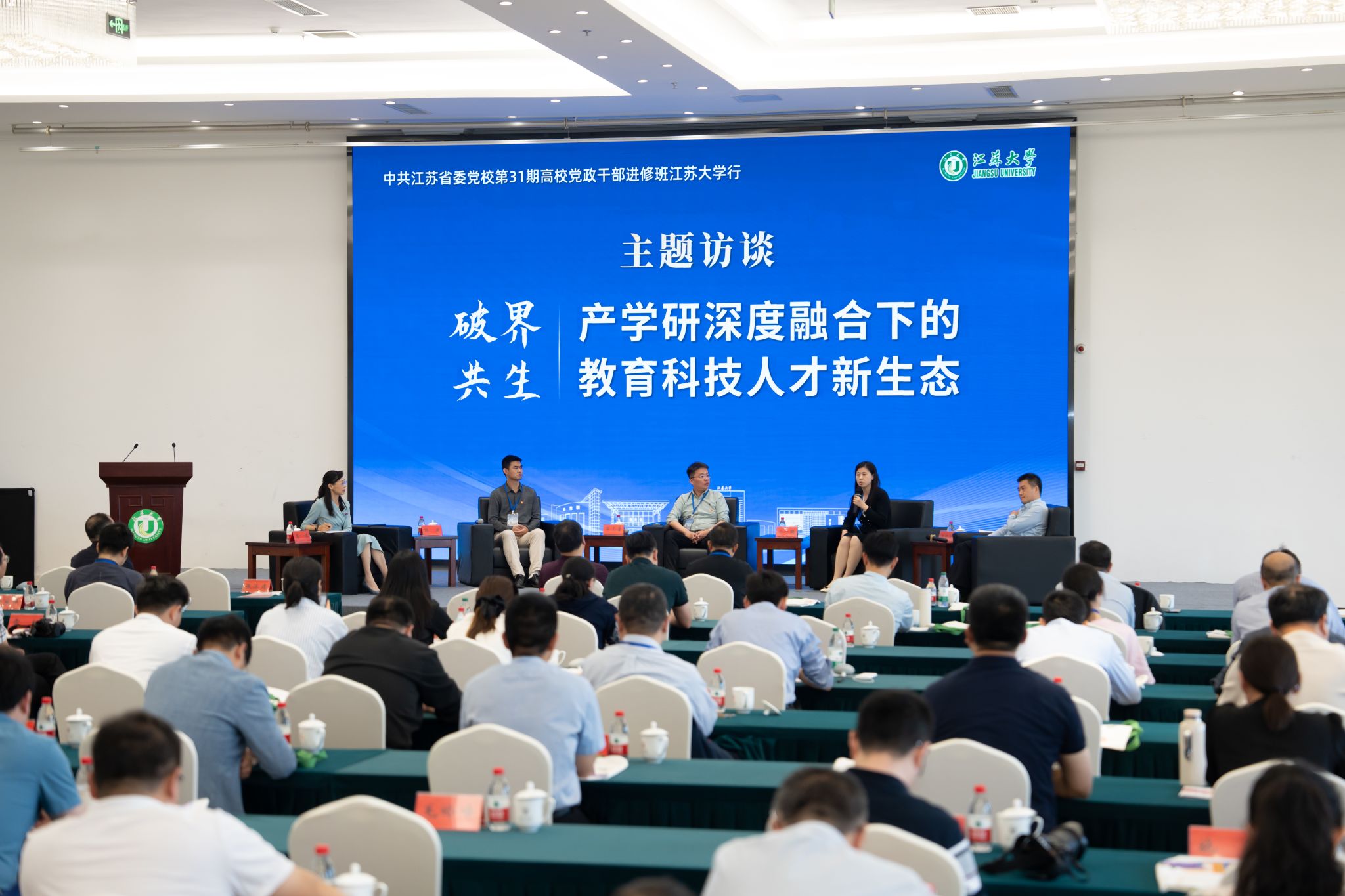访谈环节特邀五位嘉宾围绕“破界·共生·产学研深度融合下的教育科技人才新生态”主题作分享,访谈由知识产权学院直属党支部书记、副院长唐恒主持。五位嘉宾分别介绍了本校产学研合作工作的情况,东南大学科研院副院长华亮量重点围绕教育部和江苏省正在推进的高校区域技术转移转化中心建设进行深入探讨,南京航空航天大学科研院高新处副处长马一鸥分析了在大力推动成果转化的时代背景下产学研合作面临的新挑战和存在的困境,河海大学产业技术研究院副院长陈波围绕政府工作报告中提到的“加强企业主导的产学研深度融合”进行深入剖析,beat365产学研合作处处长汪少华就产学研深度合作对于将高校人才优势、创新资源转化为产业优势、发展优势所发挥的作用展开探讨。唐恒在主持中从有组织的科研、高校创新联合体、以教育部推动的“中心+节点”的高校科技成果转化网络体系等方面展开交流。