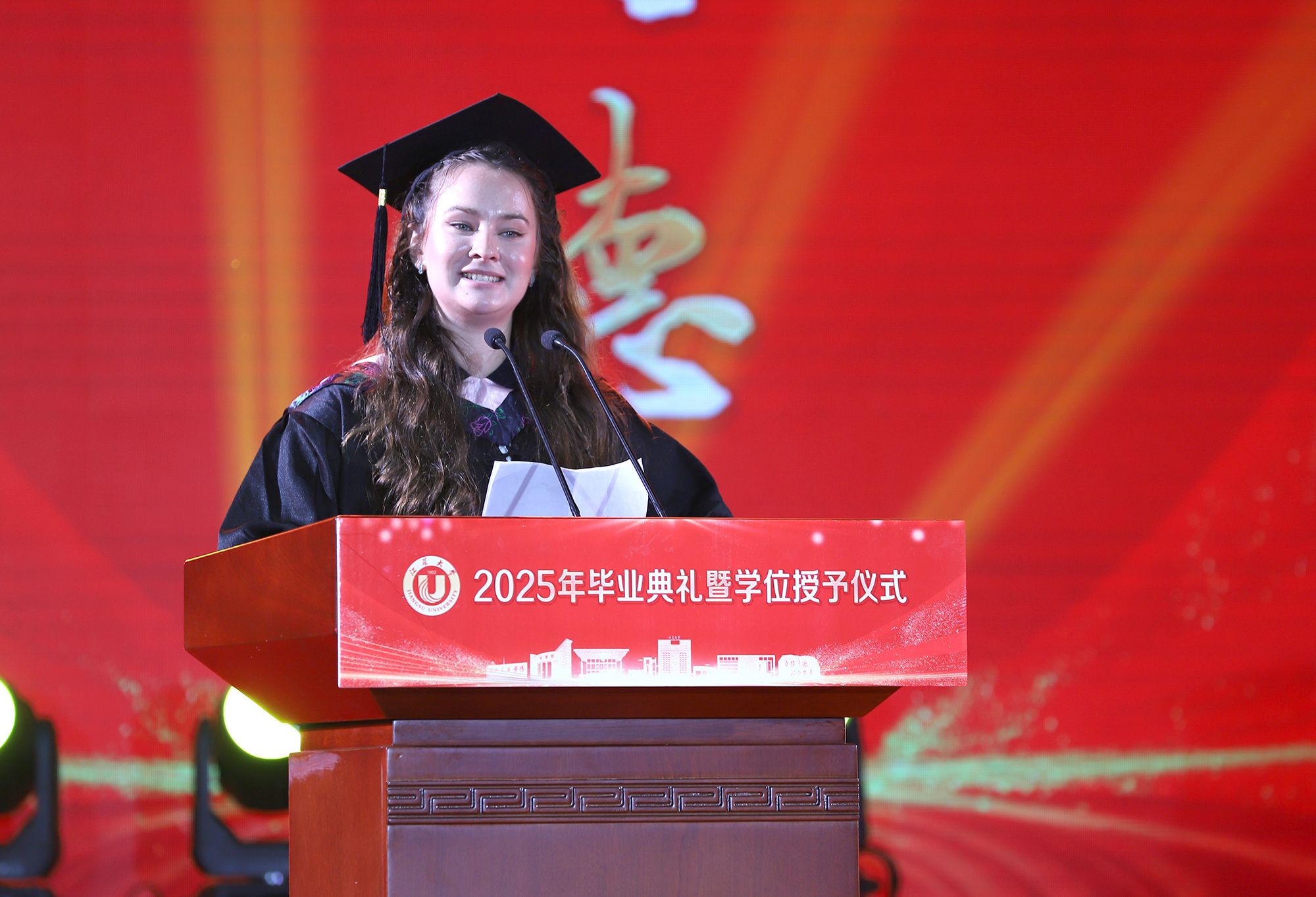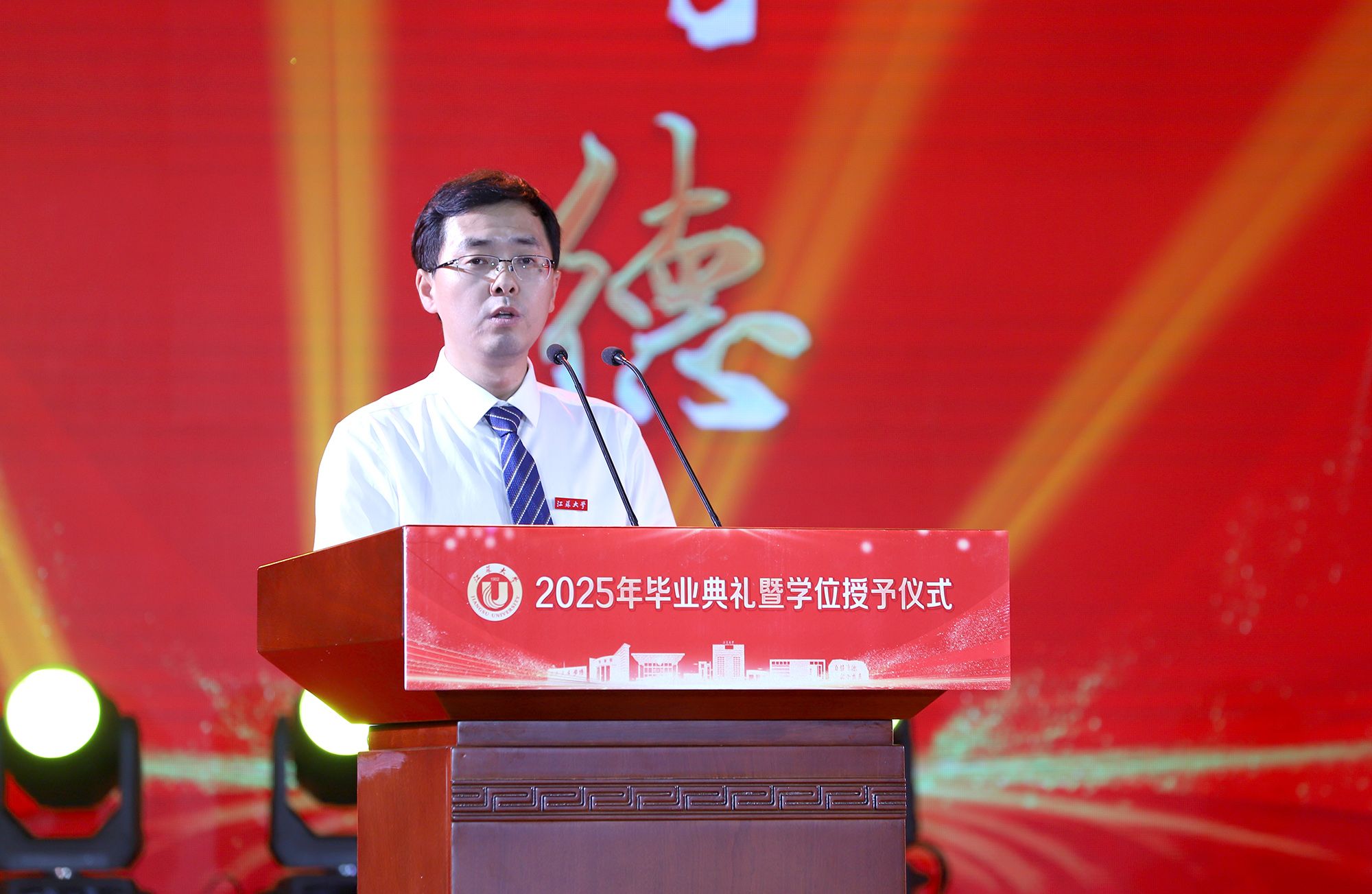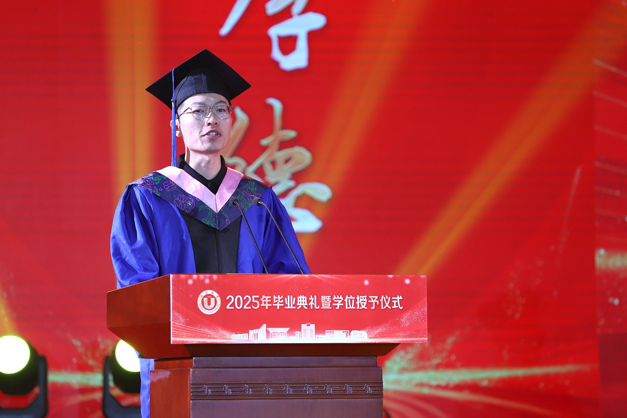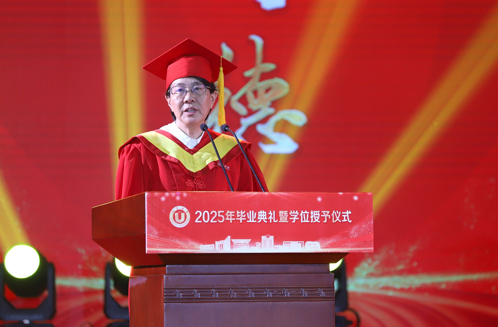 校长邢卫红发表题为《让热爱照见未来》的讲话,代表学校向全体毕业生致以热烈祝贺,向悉心关怀同学的师长、辛勤养育同学的父母以及默默支持大家成长的各界朋友,致以崇高的敬意和衷心的感谢。邢卫红说,大学更深层的意义,在于教会同学们以“热爱”为火种,照亮前路的漫长与未知。这份源自内心的热爱,已化作同学们成长路上的璀璨星光。每一位江大学子奋斗的足迹、闪耀的成绩,共同汇聚成江大校园最亮眼的青春图谱,照亮前行的每一步。邢卫红说,优秀没有标准答案,每一份热爱都定义着独特的精彩,每一次坚持都谱写着动人的篇章。她希望同学们因热爱而选择,在变革的时代中寻找内心的确定;因热爱而坚持,在平凡的岗位上成就非凡的业绩;因热爱而绽放,在生活的微光中积攒前行的力量。邢卫红希望同学们永远保持对生活的热忱,于细微处感受温暖美好,在热爱中拥抱天地辽阔。她祝愿大家带着江大赋予的热爱与力量,勇敢奔赴山海,让热爱之光照见无比璀璨的未来。