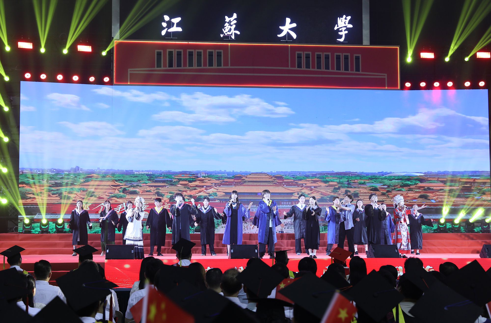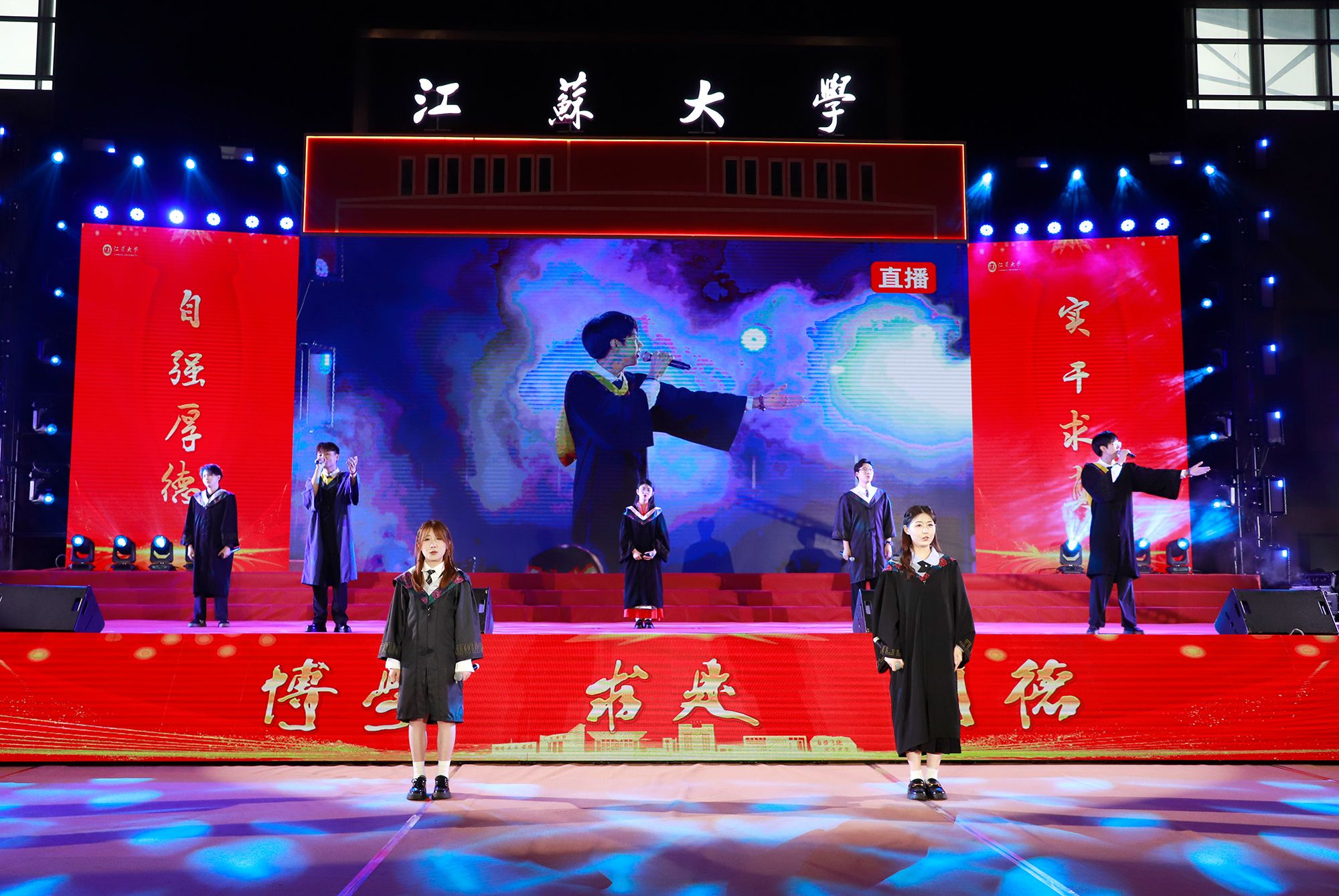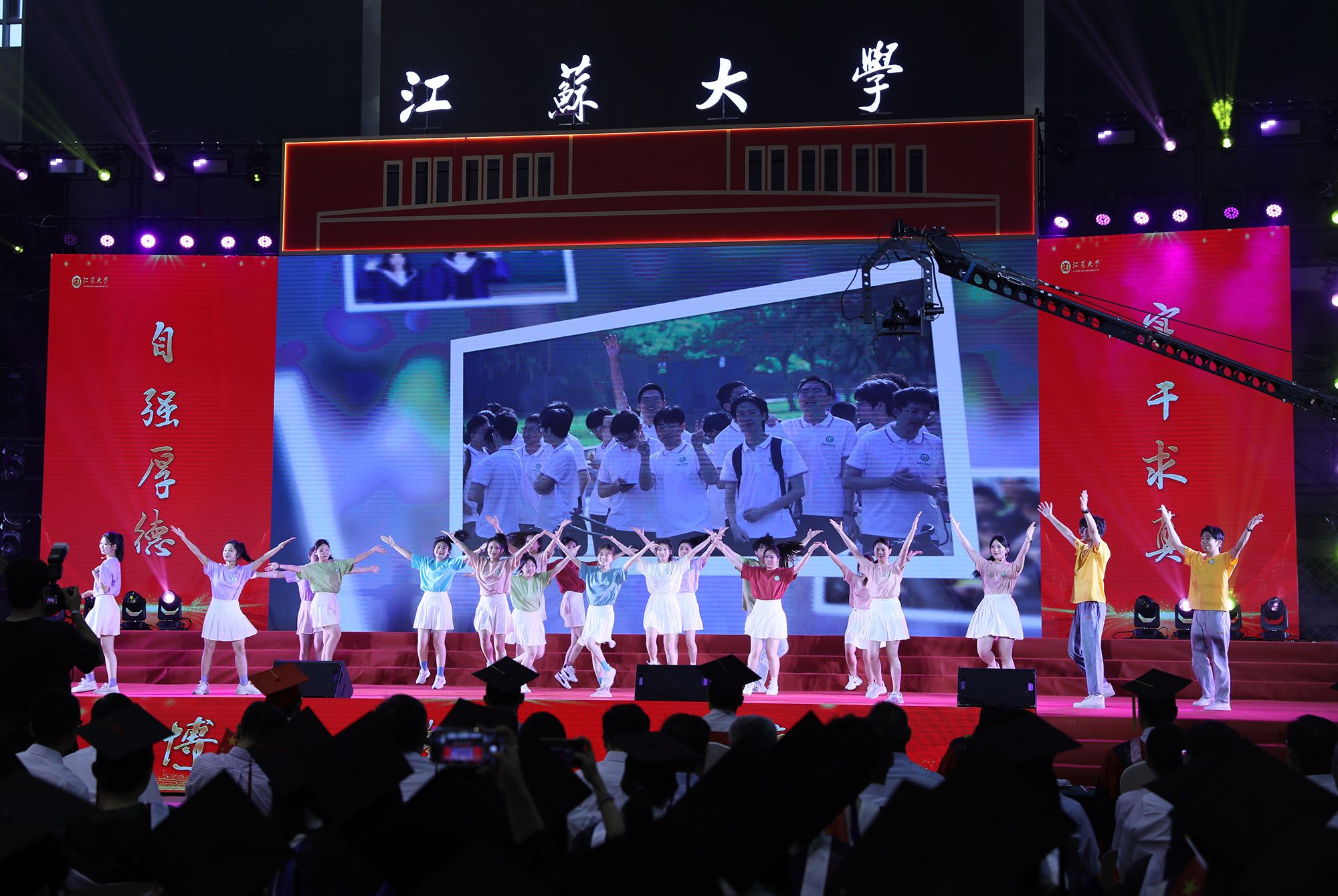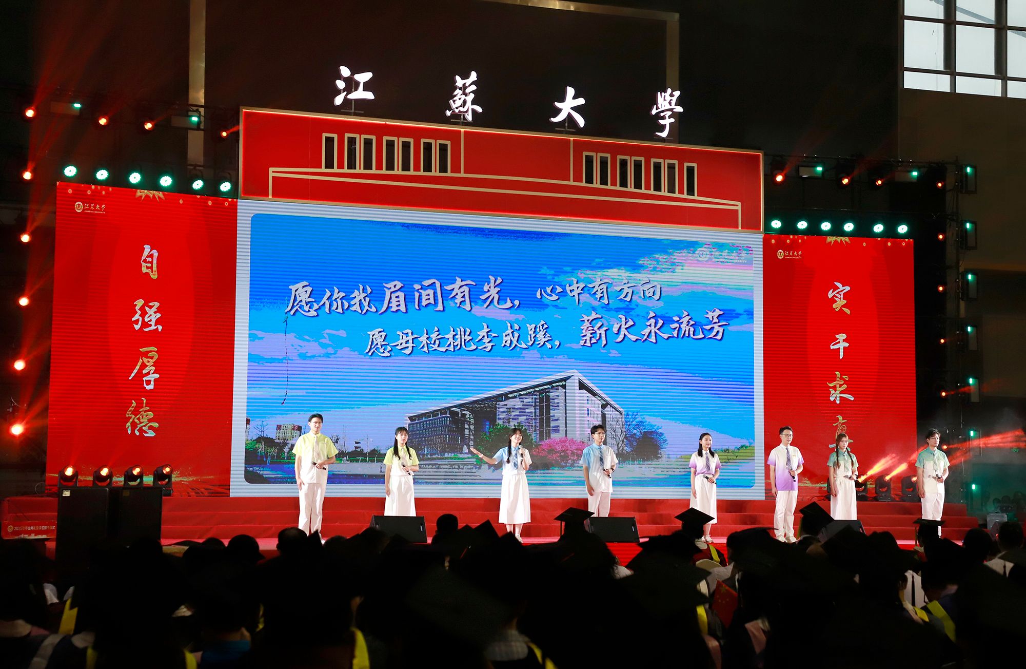 典礼上,师生代表表演了情景朗诵、歌舞等文艺节目,回顾江大时光与青春岁月。典礼最后,全场起立,合唱校歌《百年辉煌向未来》,表达对母校的深切热爱与坚定承诺。