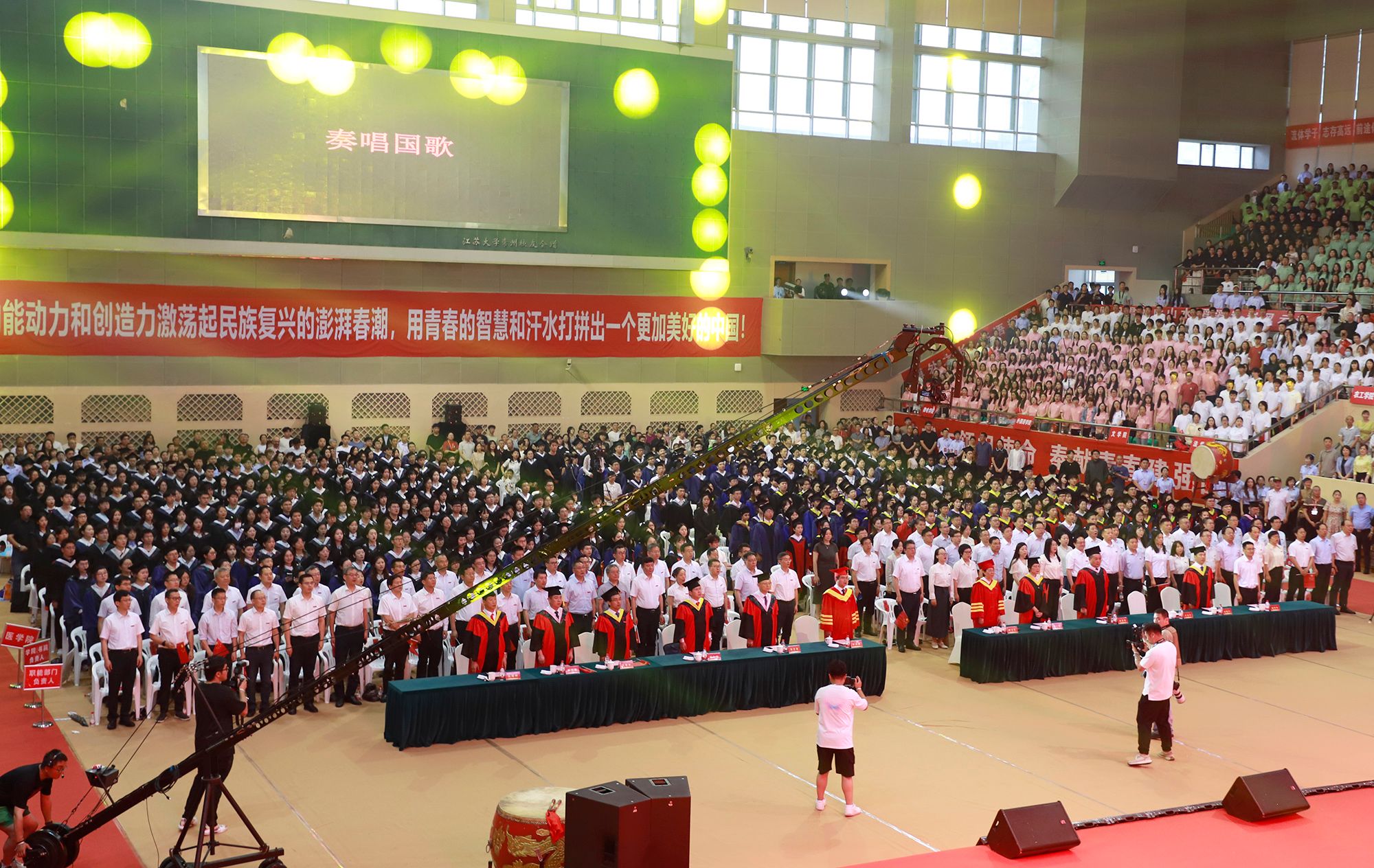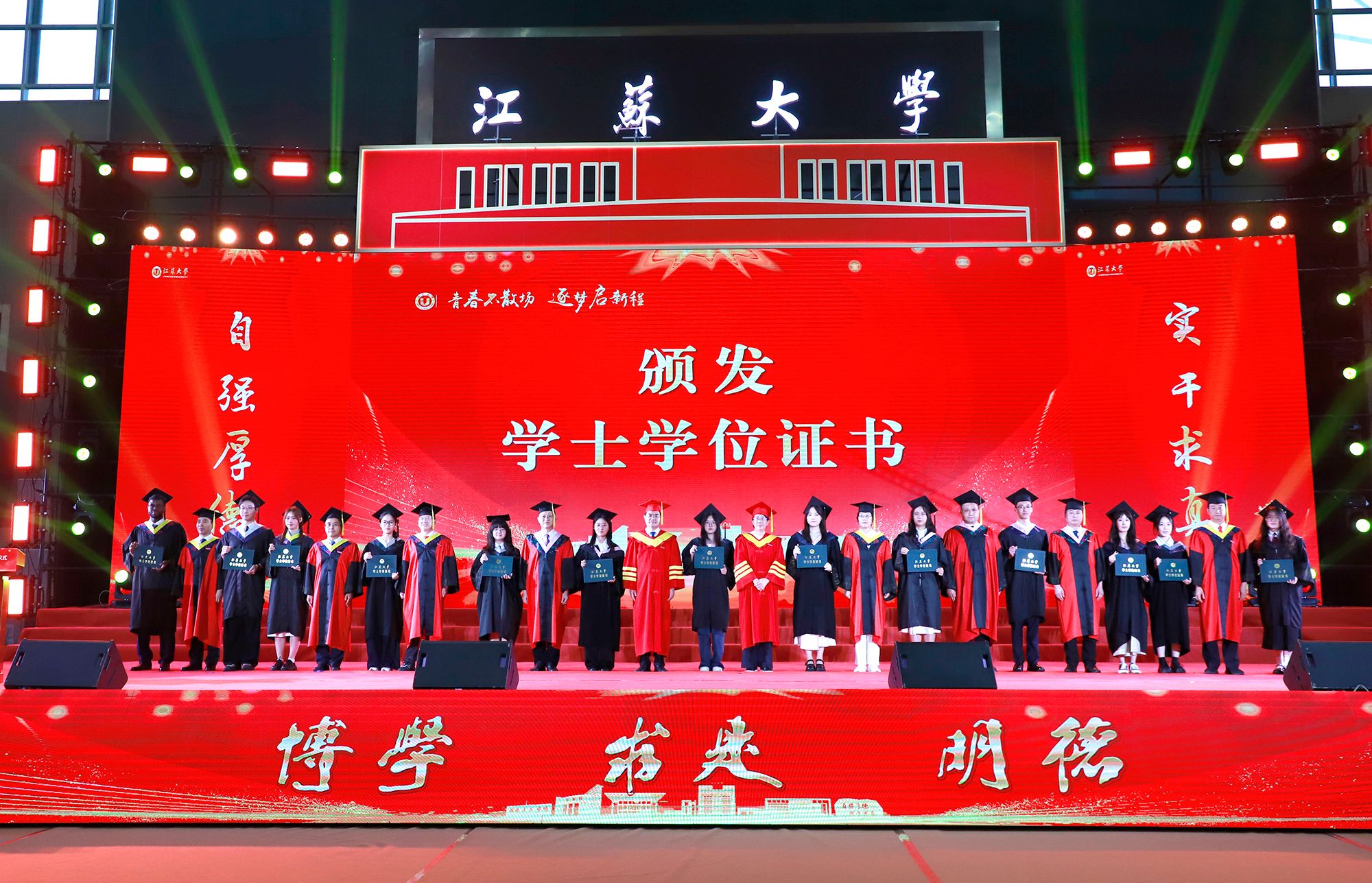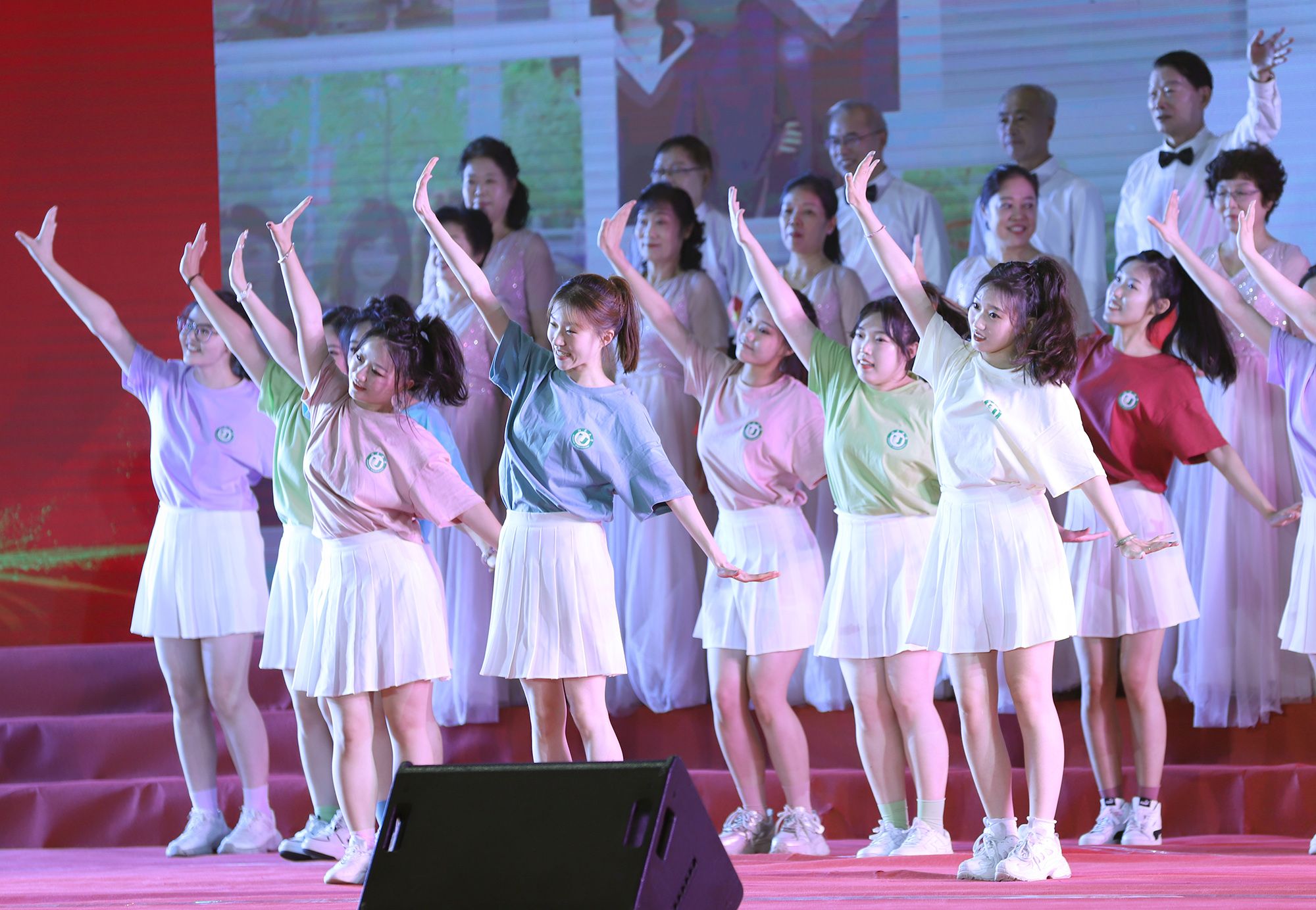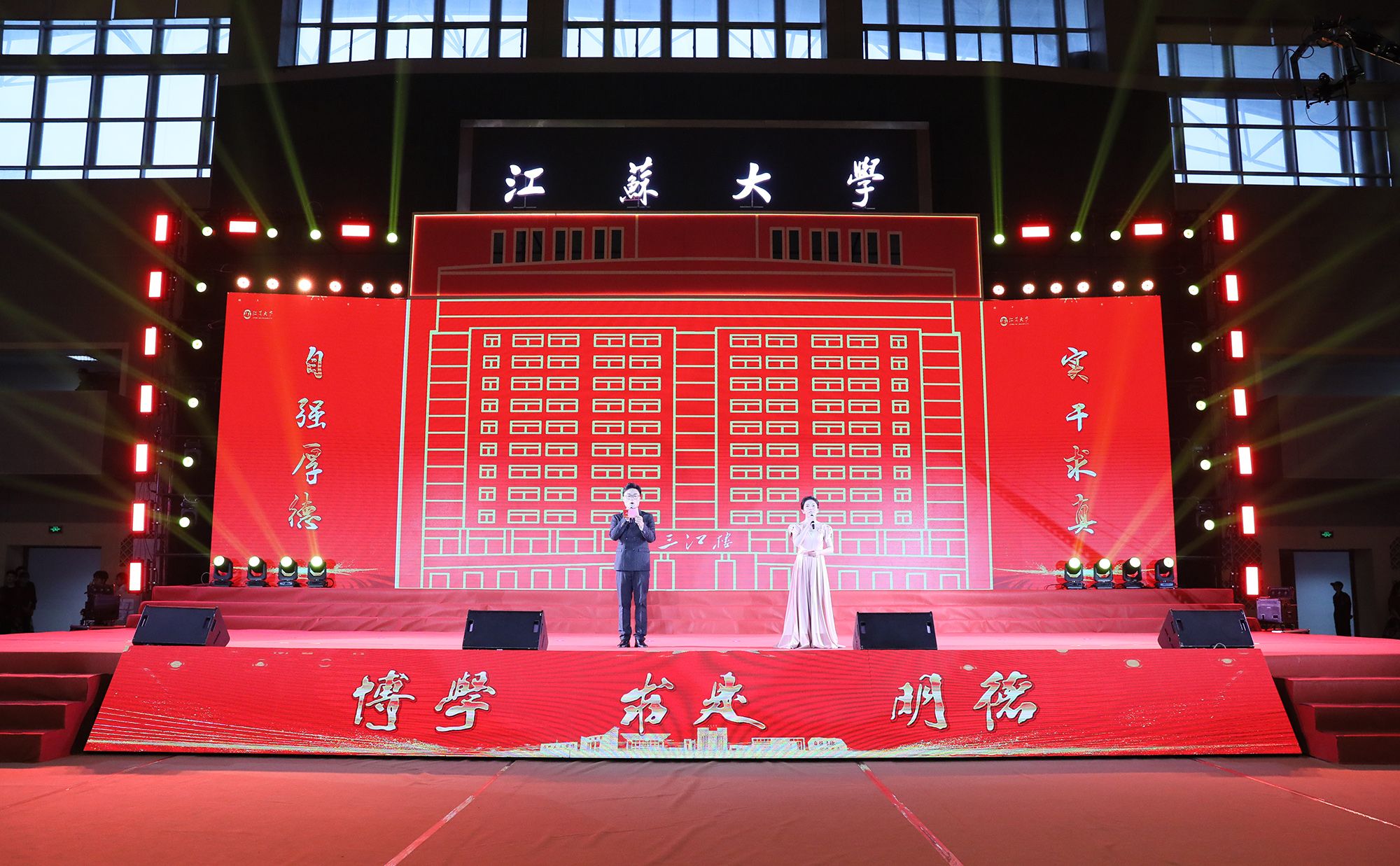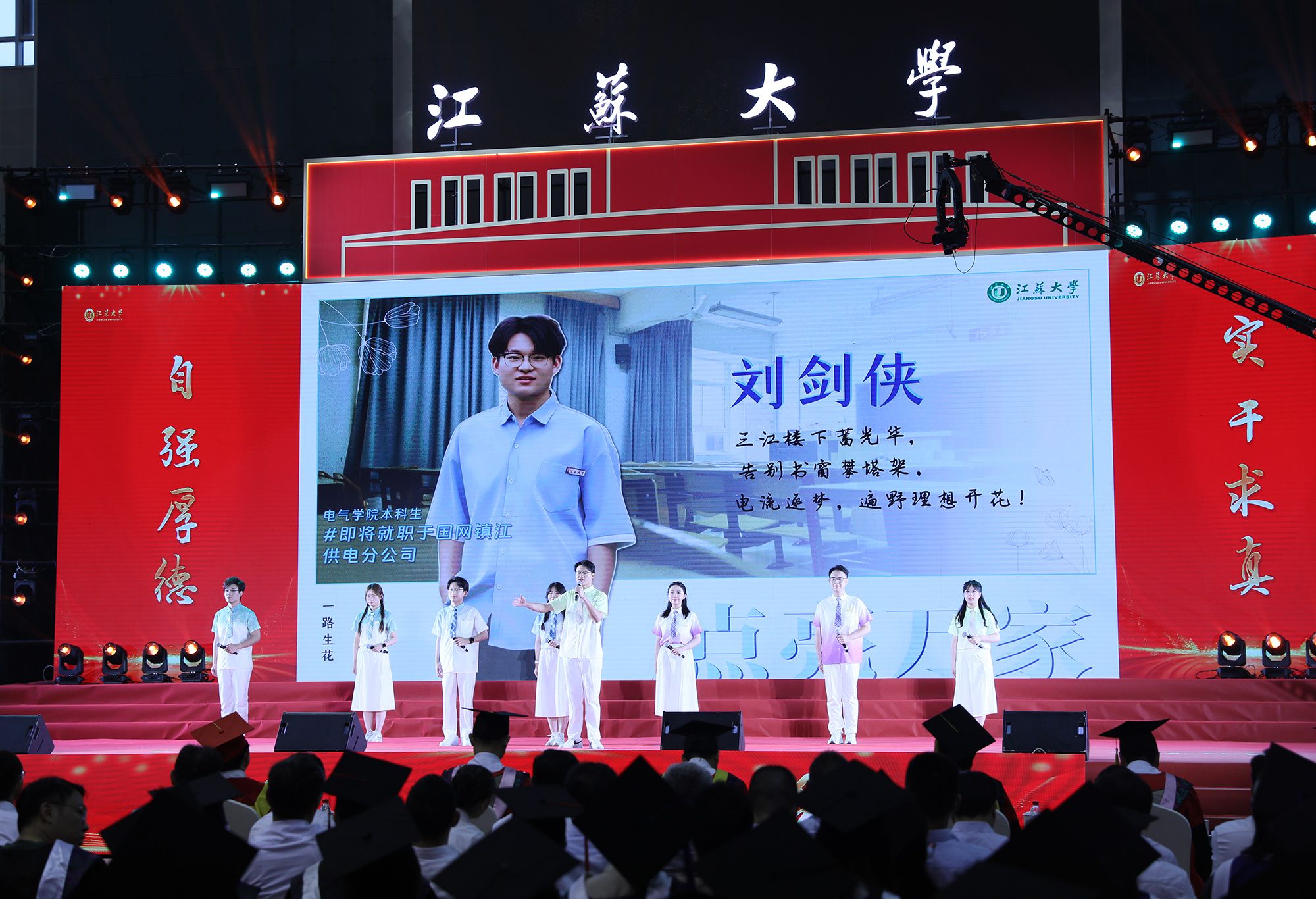 典礼上,师生代表表演了情景朗诵、歌舞等文艺节目,回顾江大时光与青春岁月。典礼最后,全场起立,合唱校歌《百年辉煌向未来》,表达对母校的深切热爱与坚定承诺。