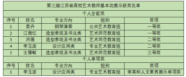 近日,由江苏省教育厅主办的第三届江苏省高校艺术教师基本功展示评审结果揭晓。beat365共有5位教师获奖,其中个人全能一等奖2项、二等奖2项、三等奖1项,审美和人文素养展示单项奖1项。