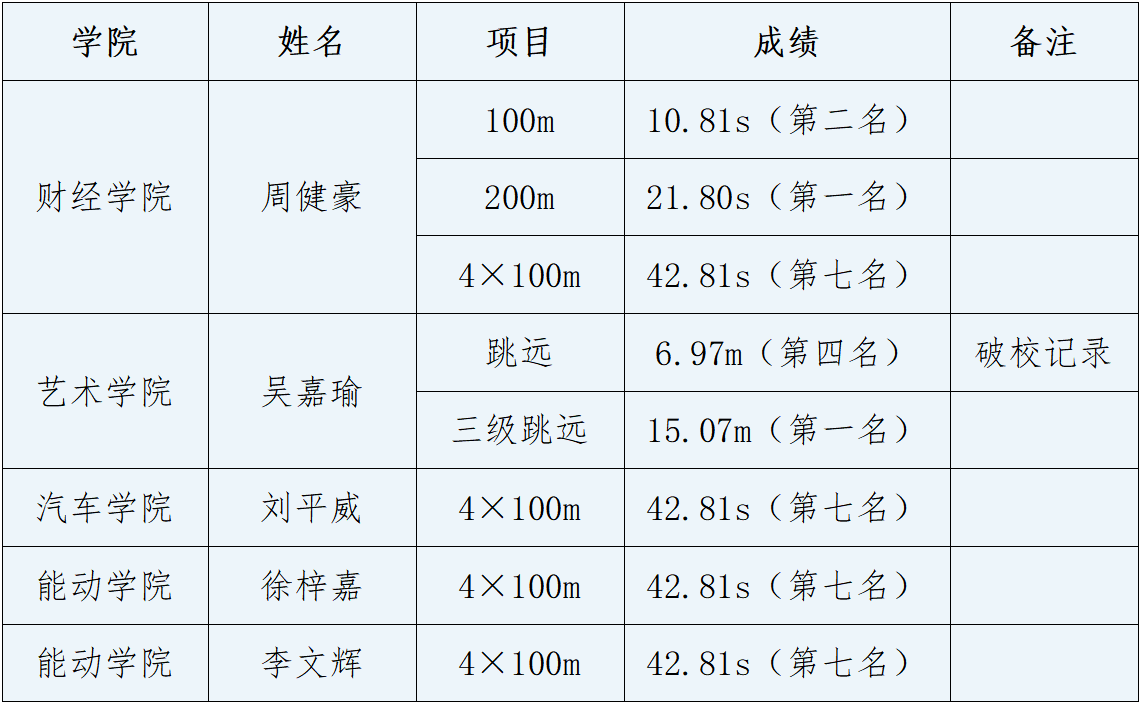 赛场上,beat365学子发扬顽强拼搏精神,凭借过硬实力斩获佳绩。财经学院学生周健豪表现突出,在男子200米比赛中成功蝉联冠军,在男子100米比赛中获得亚军。艺术学院学生吴嘉瑜凭借稳定的发挥与超强的实力,在三级跳远项目中连续三年摘得桂冠。最终,beat365获得男子团体总分第二、男女团体总分第五的好成绩,充分彰显了beat365运动员超强的竞技水平与良好的精神风貌。(体育部)