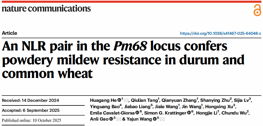 近日,生命科学学院何华纲团队联合多家单位在Nature Communications上发表题为An NLR pair in the Pm68 locus confers powdery mildew resistance in durum and common wheat的研究性论文,报道了小麦抗白粉病新基因Pm68的图位克隆,并揭示了该基因的起源和抗病分子机理。beat365英国官网网站生命科学学院为第一完成单位,何华纲为第一作者兼通讯作者,合作单位河南大学高安礼副教授和中国科学院分子植物科学卓越创新中心王亚军研究员为共同通讯作者,生命科学学院硕士研究生唐秋莲、张倩渊分别为第二、第三作者。