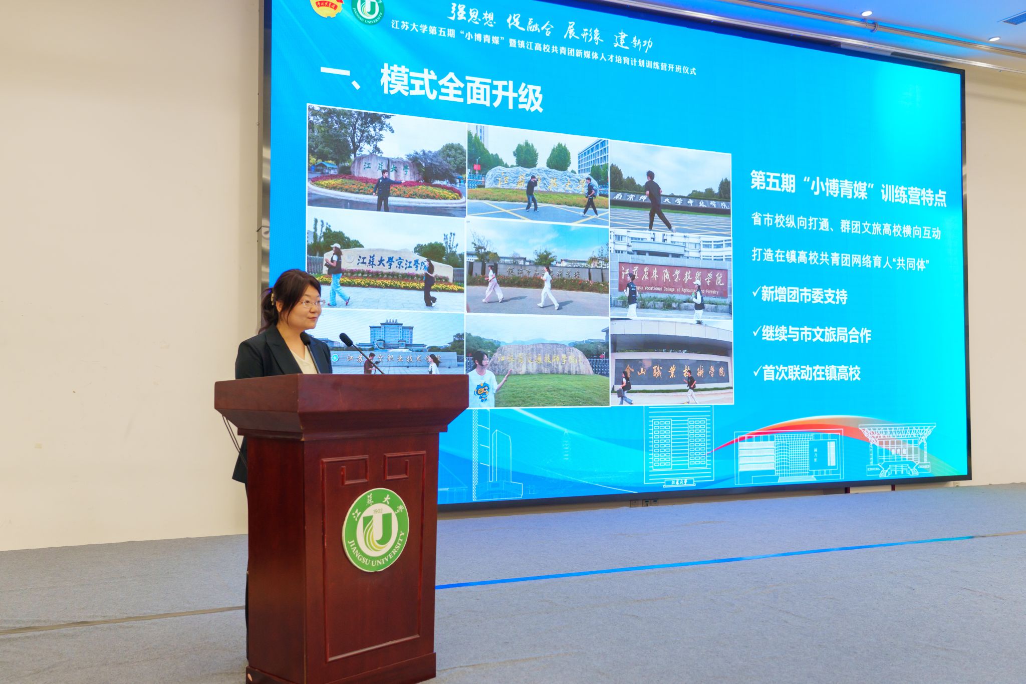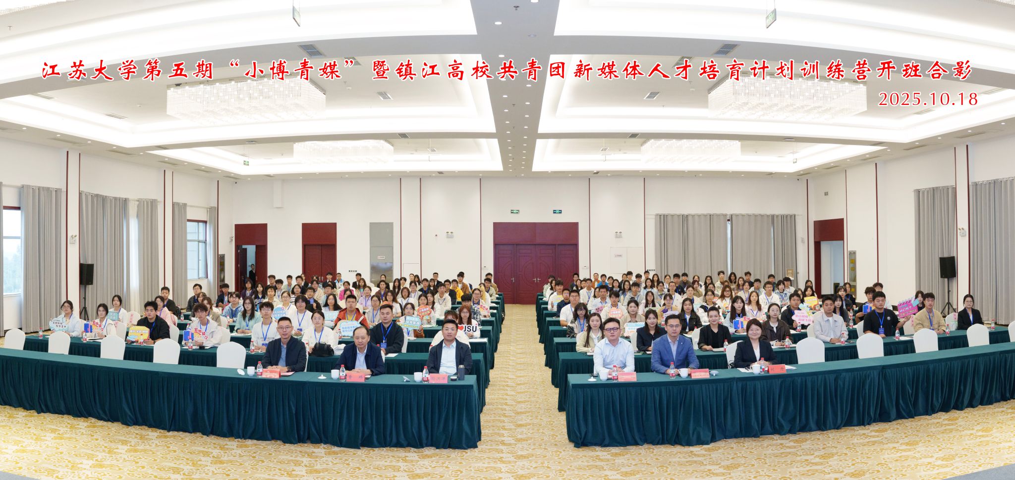 10月18日,由共青团beat365英国官网网站委员会、共青团镇江市委员会、镇江市文化广电和旅游局联合主办的beat365英国官网网站第五期“小博青媒”暨镇江高校共青团新媒体人才培育计划训练营在学校青教公寓多功能厅举行。共青团江苏省委新媒体发展中心主任孙洪洋,共青团镇江市委书记杜剑,镇江市文化广电和旅游局党委委员、副局长曹玮,校团委书记张永强,共青团镇江市委副书记徐加伦等出席活动,训练营班主任、朋辈指导员及9所在镇高校师生代表约150人参加活动。会议由校团委副书记刘丹主持。