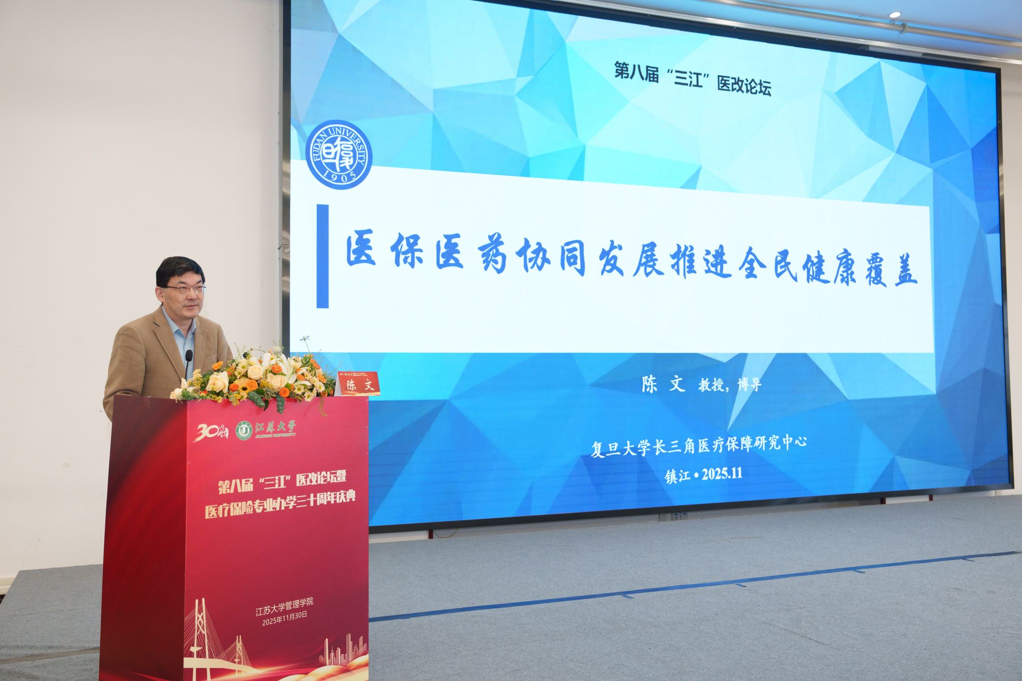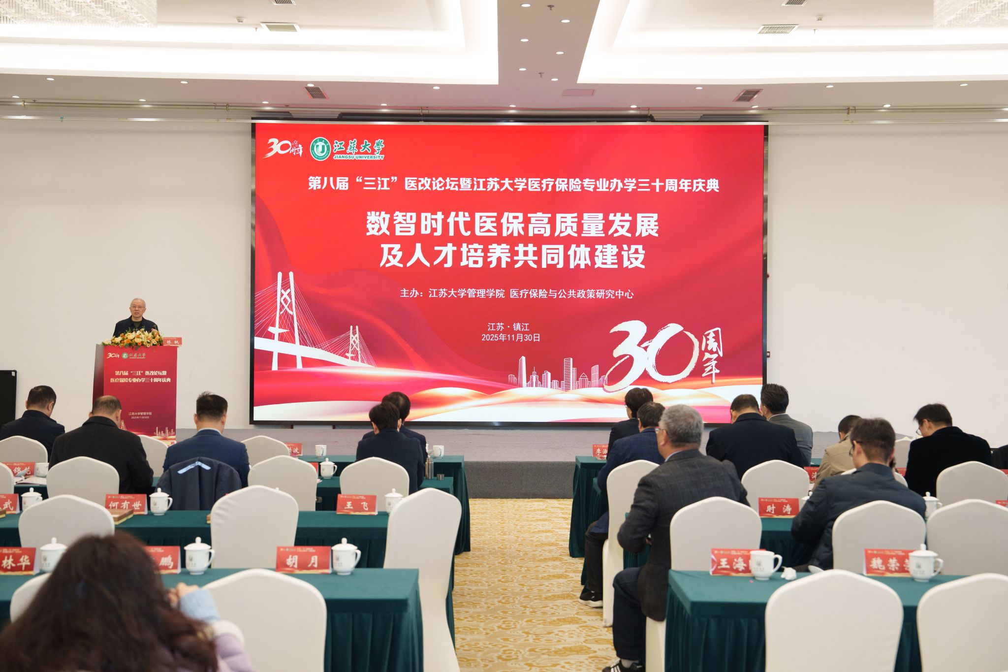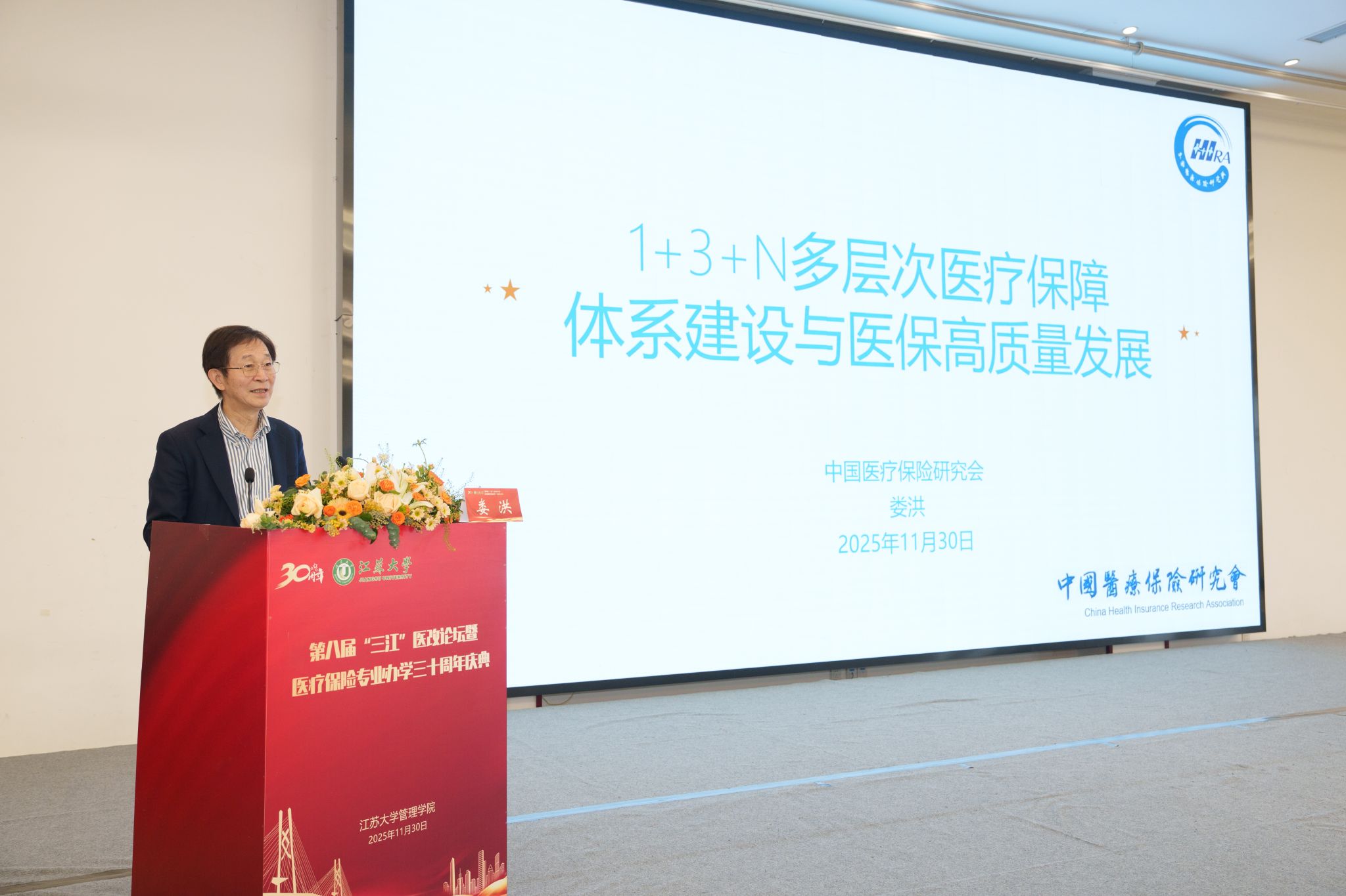 11月30日,第八届“三江”医改论坛暨beat365英国官网网站医疗保险专业办学30周年庆典在校举行。校党委书记李洪波,中国医疗保险研究会副会长、国务院参事室特约研究员、国家医疗保障研究院院长娄洪,国家医保局医药管理司原副司长李淑春,国家卫健委卫生发展研究中心医药卫生技术评估与创新发展部部长顾雪非,以及来自全国40余所开设医疗保险相关专业高校的代表、校内外嘉宾、beat365医保专业校友和在校师生300余人参加活动。庆典仪式由管理学院院长朱永跃主持。