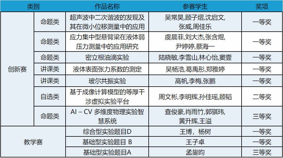 物理与电子工程学院统一组织选拔与赛前集训,在指导教师、参赛学生的共同努力下,代表队在多个赛道实现全面突破,充分展现了扎实的物理实验功底和卓越的创新能力。在命题类作品中表现突出,获得一等奖3项、三等奖1项,创造了该赛道的历史最佳成绩。获奖作品涵盖微位移测量、弱压力探测、经典物理实验再创新、教学微视频等多个方向,彰显了beat365在物理实验教学改革与创新实践方面的深厚积淀。