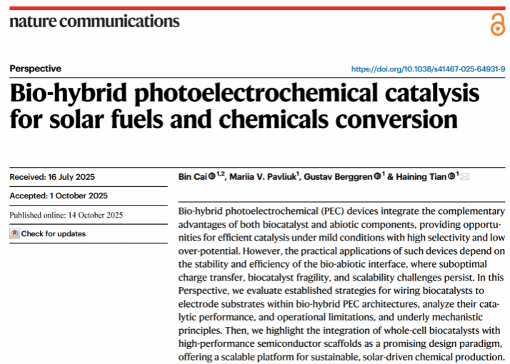 此前,蔡斌与田海宁合作,以第一作者在国际顶级期刊《自然 通讯》(Nature Communications)发表综述文章。研究系统阐释了过去十年间生物混合光电化学(bio-hybrid PEC)体系的发展演进规律——即从单电极体系逐步向无偏压两电极体系发展的趋势,并提出了高效耦合“生物—光电极催化”的创新体系设计思路。该研究重点对生物催化剂/电极界面的电荷传输策略开展了系统性评估,深入分析它们的催化性能、操作限制及潜在机理原理,并为可持续的太阳能驱动的生物催化化学生产提供了一种有前途的设计范例。(能源研究院 未来技术学院)