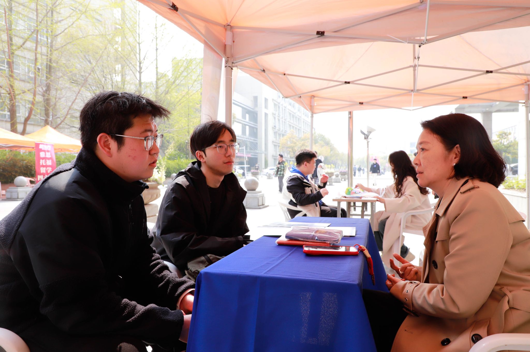本次现场咨询会在三山楼教学区附近搭建户外展台,方便学子课间就近咨询、便捷对接。各参展单位为学生提供“一对一”精准指导服务,涵盖海外短期学习、实习实践、升学申请、外语培训等。