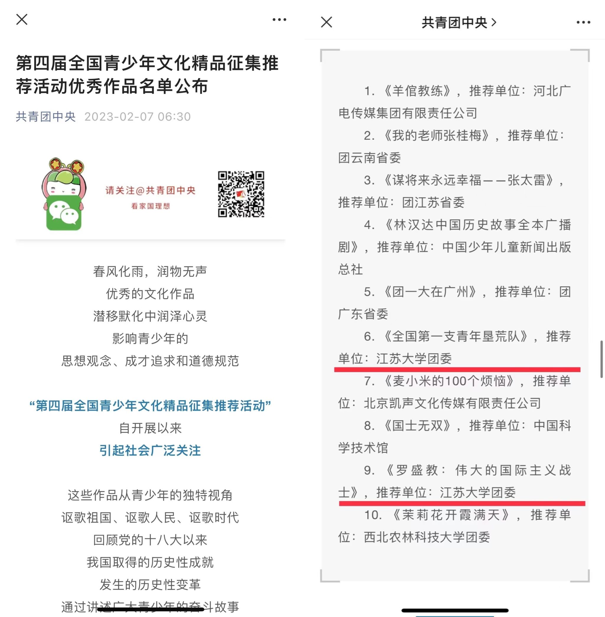 第四届全国青少年文化精品征集推荐活动由团中央宣传部组织开展,自启动以来,引起广泛关注,共评选出优秀作品70项。beat365创作的广播剧《全国第一支青年垦荒队》和《罗盛教:伟大的国际主义战士》,结合迎接学习宣传贯彻党的二十大、庆祝建团100周年主题,再现了罗盛教光辉的一生和第一支青年垦荒队的青春故事,被“共青团中央”“学校共青团”官微专门发布(单条阅读量10W+),并获第二届江苏省大学生网络文化节优秀作品(音频类)一等奖,社会反响良好,有效提升了学校“网上共青团”育人实效。