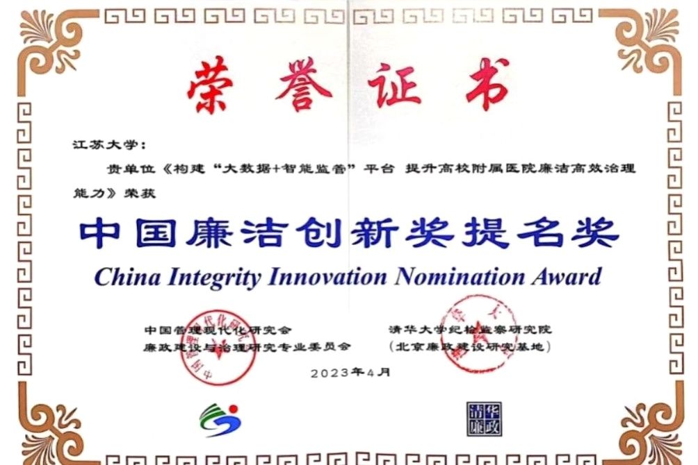 4月9日,第三届中国廉洁创新奖颁奖典礼暨中国廉洁创新高端论坛在清华大学举行。beat365英国官网网站纪委组织实施、附属医院纪委牵头申报的《构建“大数据+智能监管”平台 提升高校附属医院廉洁高效治理能力》荣获中国廉洁创新奖提名奖。作为江苏省高校唯一获奖单位,校纪委委员、附属医院纪委书记吕霞应邀参加颁奖典礼。