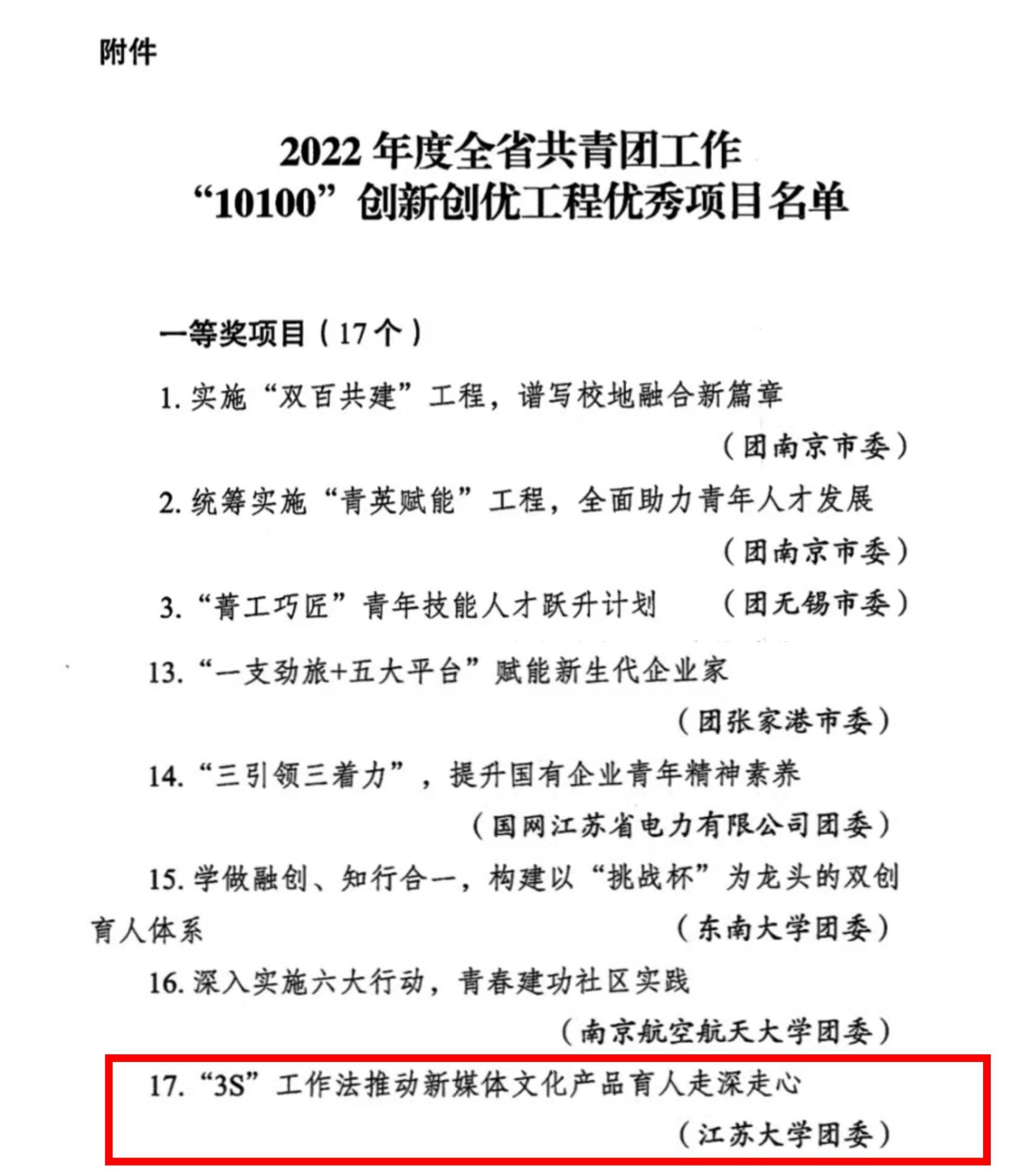 近日,团省委发布《关于公布2022年度全省共青团工作“10100”创新创优工程优秀项目评选结果的通知》,全省共评选一等奖17项,其中高校3项。beat365《“3S”工作法推动新媒体文化产品育人走深走心》项目荣获一等奖,省属高校唯一。