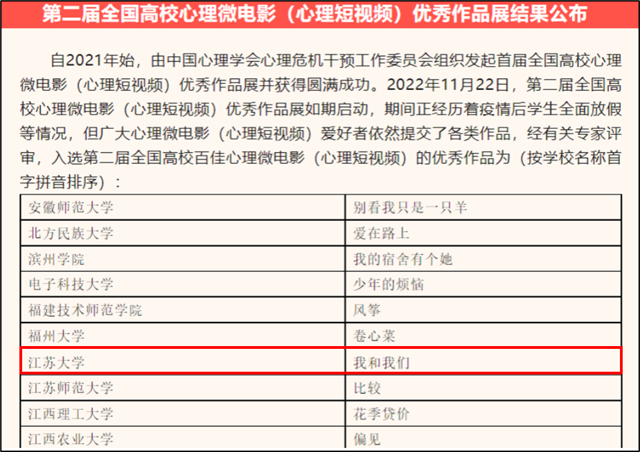本次比赛于2022年11月正式启动,学校高度重视,积极动员,在全校范围内征集、选拔优秀作品。通过主动申报,层层选拔,农工学院、汽车学院、能动学院、电气学院、文学院、教师教育学院和药学院联合申报的心理微电影《我和我们》被推荐参赛。(党委学生工作部(处))