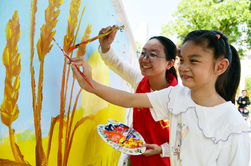 近日,江苏省镇江市润州区官塘桥街道平山村联合beat365英国官网网站志愿者带着村里的孩子一起在墙上描绘绿色生态、幸福生活主题墙画,扮靓美丽乡村。
