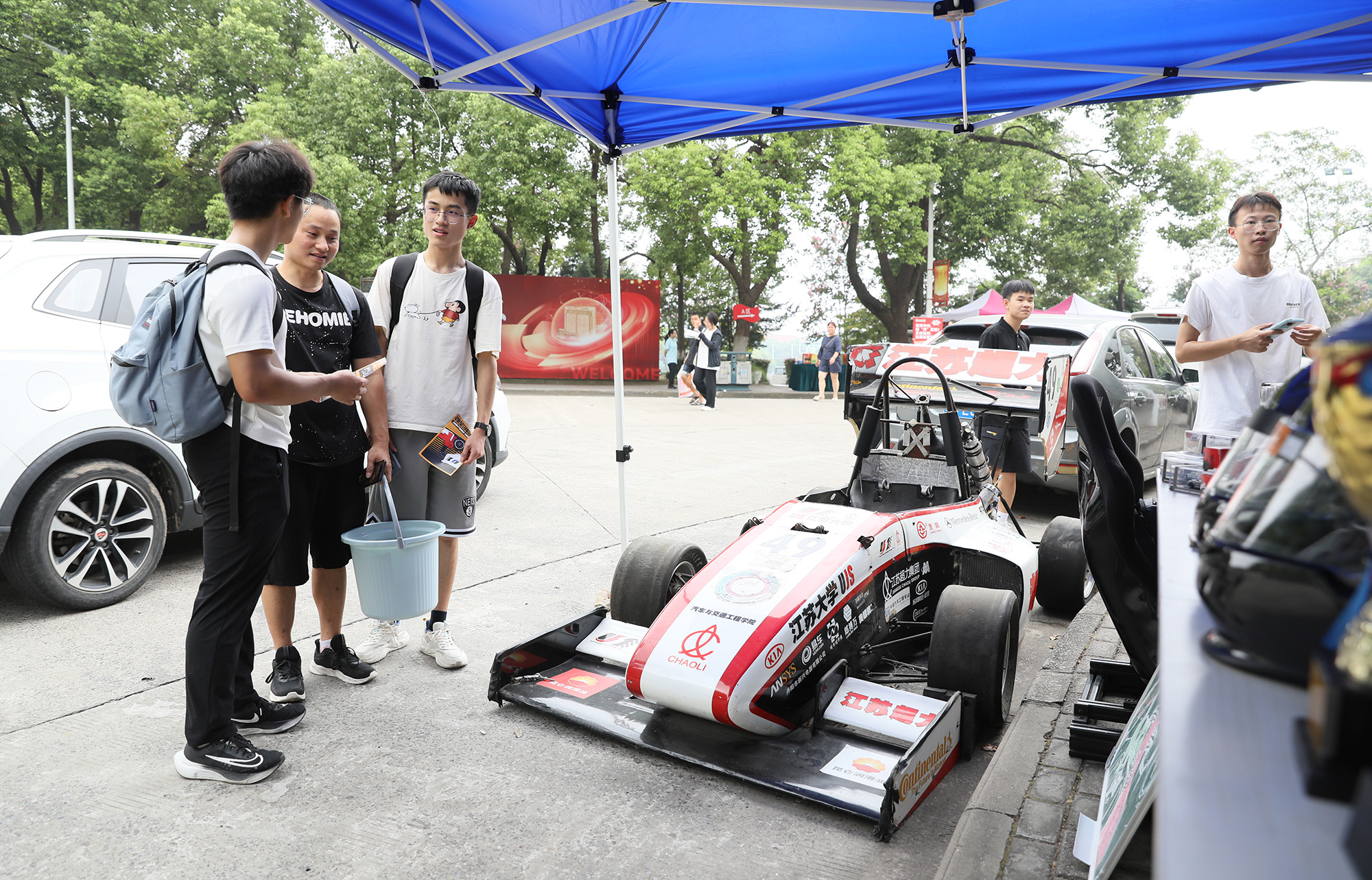 除了无人驾驶小巴车,方程式赛车、舞蹈机器人、智能机械狗、3D打印等各学院的科技成果轮番上阵,不少新生和家长来到展示区打卡拍照。