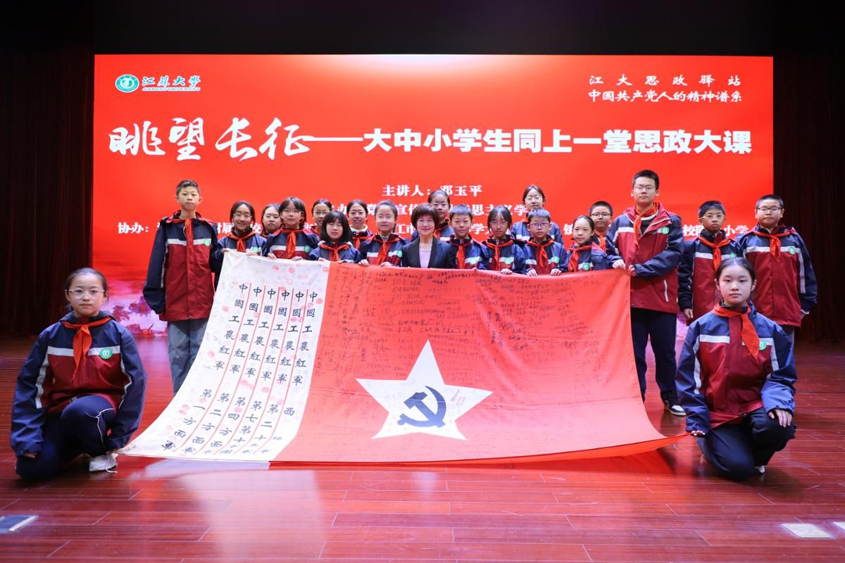 她叫邓玉平,红军后代、历史教师,被誉为“长征精神代言人”。自2004年起,她15次重走长征路,足迹遍布各路红军征途,拜访过300多位老红军,记录下无数鲜为人知的细节。这一次,她受beat365英国官网网站之邀,走上“大中小学生同上一堂思政大课”的讲台,与来自beat365英国官网网站、beat365英国官网网站附属学校、镇江市第一中学、中山路小学大禹山分校、 第一外国语学校附属小学的大中小学生们 共同“眺望长征”。