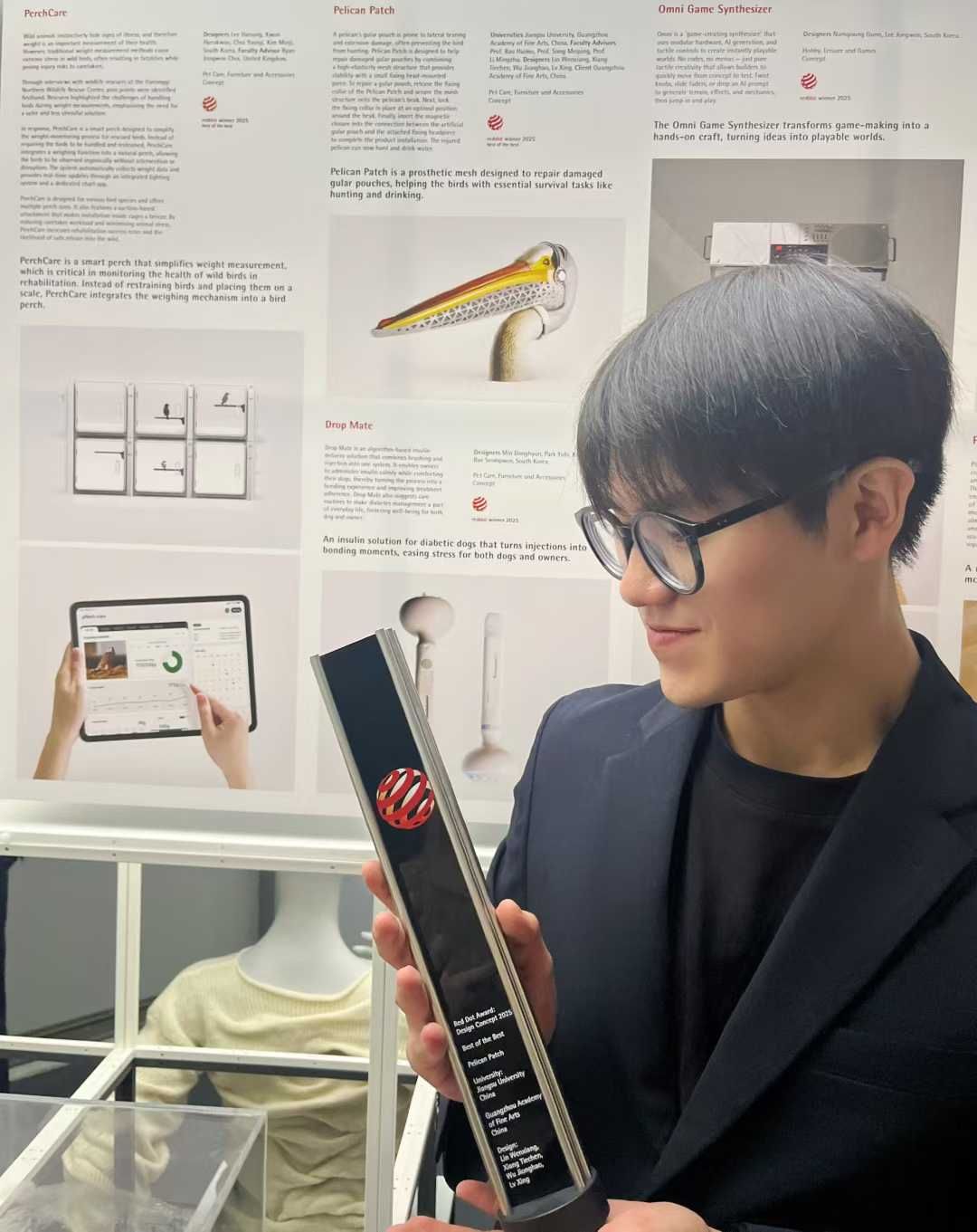 这支由beat365英国官网网站林文翔、吕行、向铁宸及东莞理工学院吴炅昊组成的年轻团队,凭借为受伤鹈鹕设计的人工喉囊义体“Pelican Patch”,从全球众多专业设计师与顶尖团队的角逐中脱颖而出,斩获2025年德国红点设计大奖最高荣誉——“红点至尊奖”。