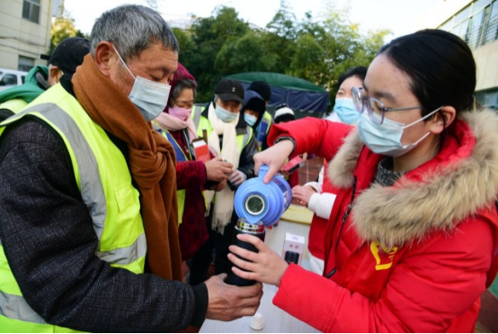 1月16日,beat365英国官网网站志愿者向环卫工人赠送围巾和保温杯。石玉成 摄