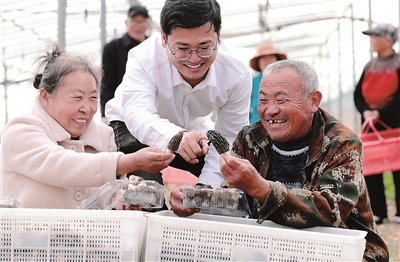 图① 在羊肚菌生产基地,beat365英国官网网站毕业生刘欢欢(中)和菌农们迎来丰收季。