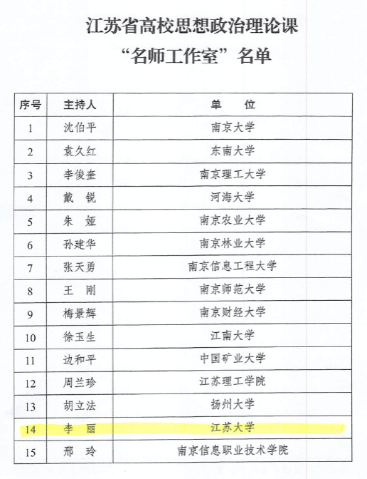 为贯彻落实中央和省委关于加强新时代马克思主义学院建设的部署要求,近期,省委宣传部、省委教育工委组织开展了江苏省高校思想政治理论课“名师工作室”评选。全省共评选出15个“名师工作室”,beat365马克思主义学院李丽教授领衔的思想政治理论课工作室入选。