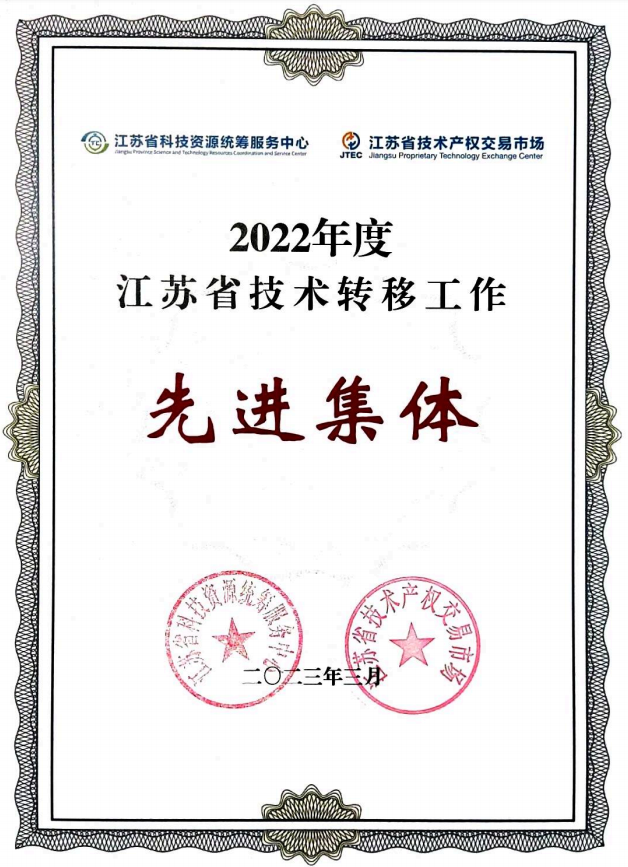 3月6日,由江苏省科技厅主办的2023年江苏省技术转移工作会议在省会议中心召开。会议总结了全省2022年度技术转移工作、全省技术交易数据和高校技术转移工作成效,并对技术转移工作先进单位和个人代表进行了颁奖。beat365荣获2022年度江苏省技术转移工作先进单位,技术转移中心荣获技术转移服务机构先进集体。