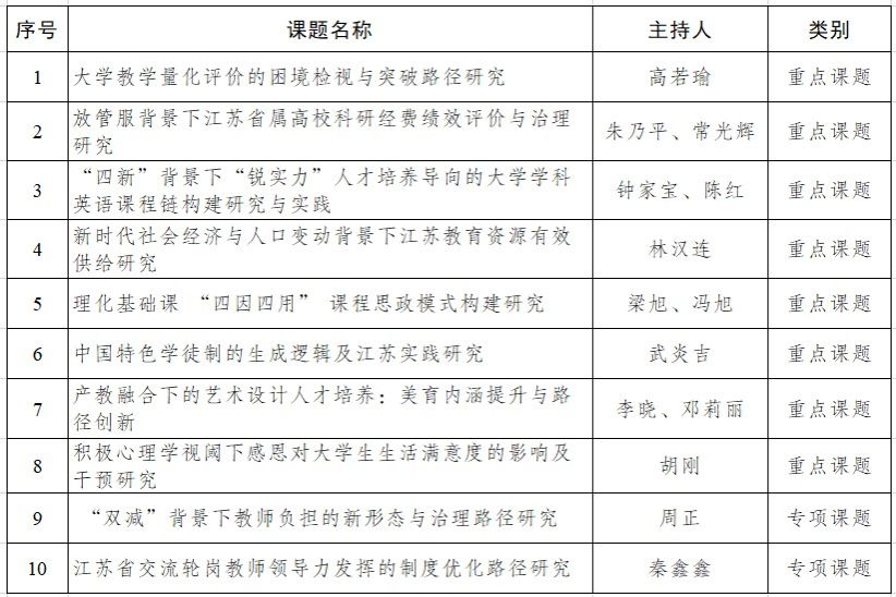 日前,江苏省教育科学规划领导小组办公室下发《关于公布2022年度省教育科学规划课题立项名单的通知》,公布了2022年度江苏省教育科学规划课题立项评审结果,beat365获批10个项目,总立项数位居全省高校前列。其中,重点课题8项、专项课题2项。