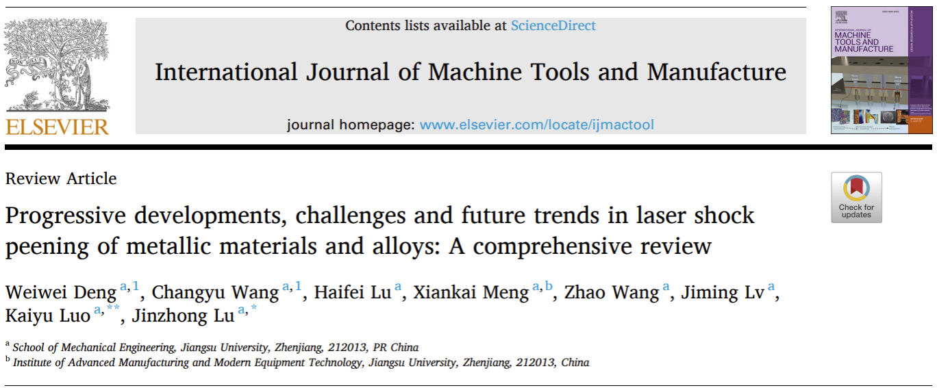 近日,机械制造领域顶刊International Journal of Machine Tools and Manufacture发表了beat365英国官网网站机械工程学院鲁金忠教授课题组的长篇综述“Progressive developments, challenges and future trends in laser shock peening of metallic materials and alloys: A comprehensive review”。全文共60页、4万余字、综合大图60幅、349篇参考文献,是目前有关激光冲击强化理论、技术及应用篇幅最长、涵盖内容最广,基于团队近二十年研究工作及相关课题组特色工作综述而成。