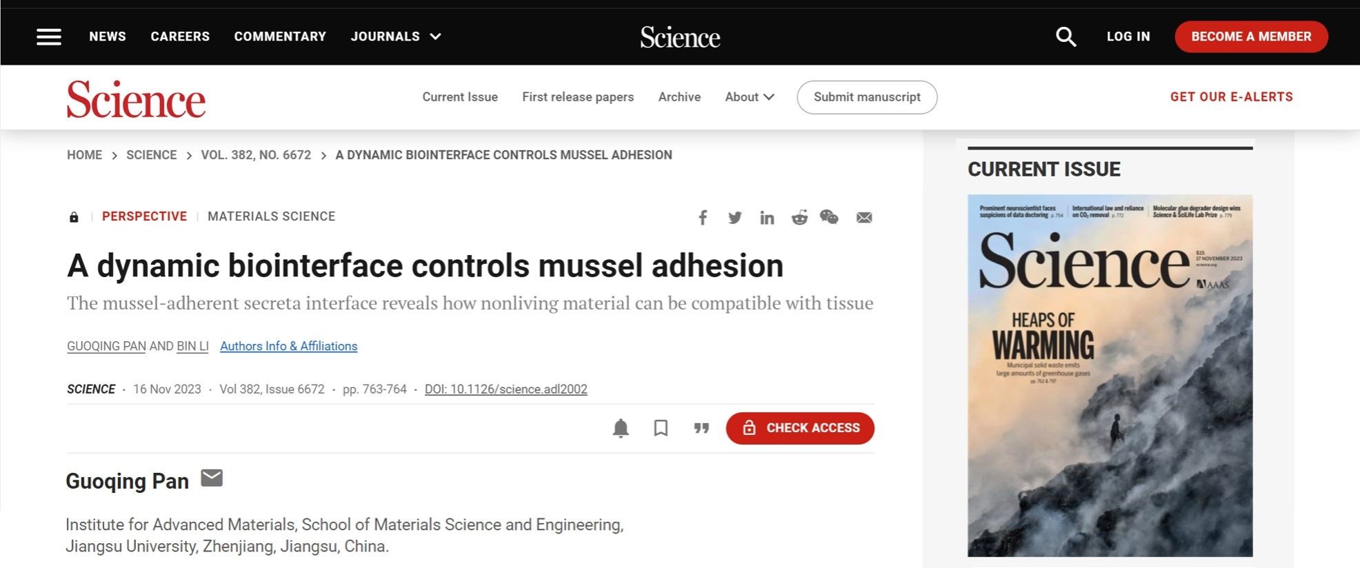 11月17日,国际著名学术期刊Science发表了beat365材料科学与工程学院潘国庆教授、苏州大学李斌教授应邀合作撰写的题为A dynamic biointerface controls mussel adhesion(Doi: 10.1126/science.adl2002) 的前瞻性文章。beat365英国官网网站材料科学与工程学院、新材料研究院为该论文的第一单位,潘国庆为论文的第一作者及通讯作者。