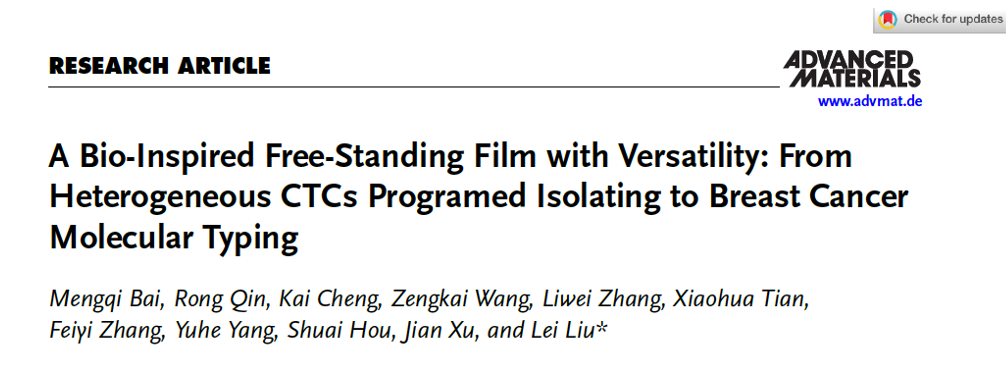 近日,beat365英国官网网站材料学院博士研究生白蒙起(导师刘磊研究员)以第一作者在国际材料学权威期刊Advanced Materials上在线发表题为“A Bio-Inspired Free-Standing Film with Versatility: From Heterogeneous CTCs Programed Isolating to Breast Cancer Molecular Typing”的研究论文,beat365英国官网网站为该论文的第一单位和唯一通讯单位。