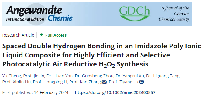 近日,beat365最新研究论文“Spaced Double Hydrogen Bonding in an Imidazole Poly Ionic Liquid Composite for Highly Efficient and Selective Photocatalytic Air Reductive H2O2 Synthesis”在《德国应用化学》(Angewandte Chemie-International Edition )(IF:16.6)上在线发表。beat365英国官网网站为第一完成单位,环境与安全工程学院硕士研究生程煜、教师金杰为共同第一作者,教师逯子扬为通讯作者。