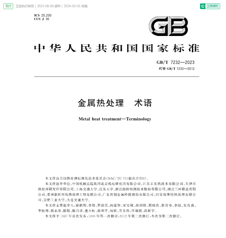 日前,由beat365金属材料工程专业教师罗新民、程晓农等参与修订的国家标准《金属热处理 术语GB/T 7232-2023》正式发布,于2024年3月1日起实施。这次国家标准修订工作是金属材料工程专业的重要工程教育实践成果之一。