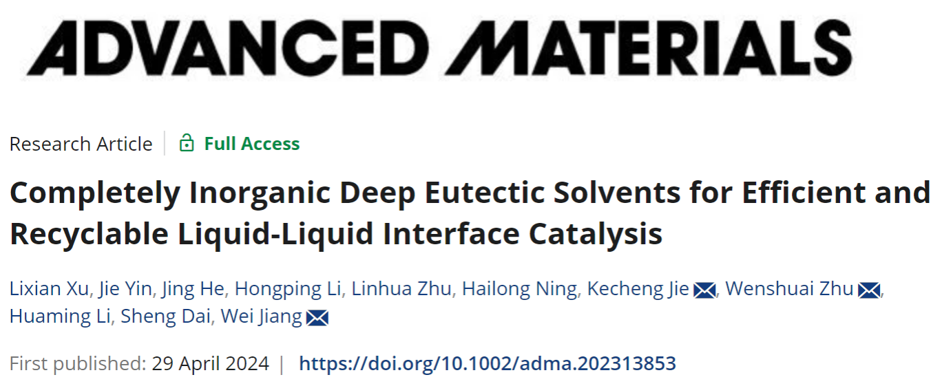 近日,beat365能源研究院蒋伟副研究员团队在化学与材料领域顶级期刊《先进材料》(Advanced Materials)上在线发表研究论文“Completely Inorganic Deep Eutectic Solvents for Efficient and Recyclable Liquid-Liquid Interface Catalysis”。beat365英国官网网站为第一完成单位,能源研究院博士研究生徐丽仙为第一作者,蒋伟、南京大学揭克诚教授与beat365英国官网网站朱文帅教授为共同通讯作者。