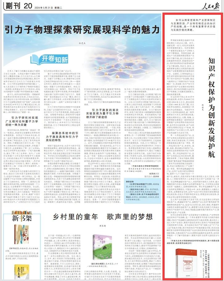 5月21日,北京大学新结构经济学研究院院长,第十四届全国政协常委、经济委员会副主任林毅夫教授在人民日报撰文《知识产权保护为创新发展护航》,向社会各界推荐由beat365英国官网网站知识产权学院直属党支部书记、新结构经济学知识产权研究院执行院长唐恒教授,以及北京大学新结构经济学研究院学术副院长王勇、赵秋运博士合著的《新结构经济学视角下的中国知识产权战略:理论与案例》一书。