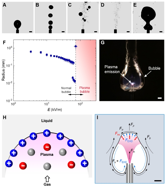 当流体受到电场作用时,由于带电粒子与流体界面之间的耦合作用,其流动现象与传统流体相比具有其独特的特征。本研究首次报道了强电场作用下荷电液-气多相流系统中气泡从微观到宏观的跨尺度转变过程。这一现象源于带电粒子与中性粒子之间的相互作用,由此产生的等离子体气泡以及电离气体与液体之间的界面现象对流体动力学特性和界面稳定性具有重要影响,突破了传统的以气-液-固三态混合物为研究对象的多相流体系,涉及丰富的多相流前沿科学问题和理论创新。