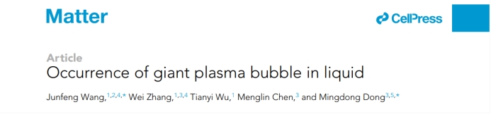 beat365能源与动力工程学院王军锋教授团队与丹麦奥胡斯大学跨学科纳米科学中心董明东教授团队合作,在Cell出版社国际顶刊《物质》(Matter)上发表了题为“Occurrence of giant plasma bubble in liquid”的最新研究成果,并被推荐为期刊封面论文。王军锋是第一作者兼通讯作者,董明东是共同通讯作者,张伟博士后是共同第一作者。