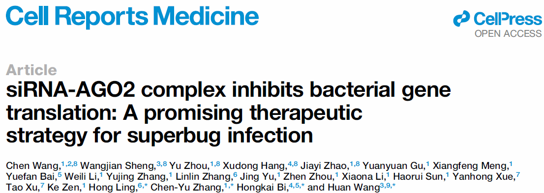 近日,药学院王琛作为第一作者在Cell子刊Cell Reports Medicine(中科院一区TOP)发表题为siRNA-AGO2 complex inhibits bacterial gene translation: A promising therapeutic strategy for superbug infection的研究论文。