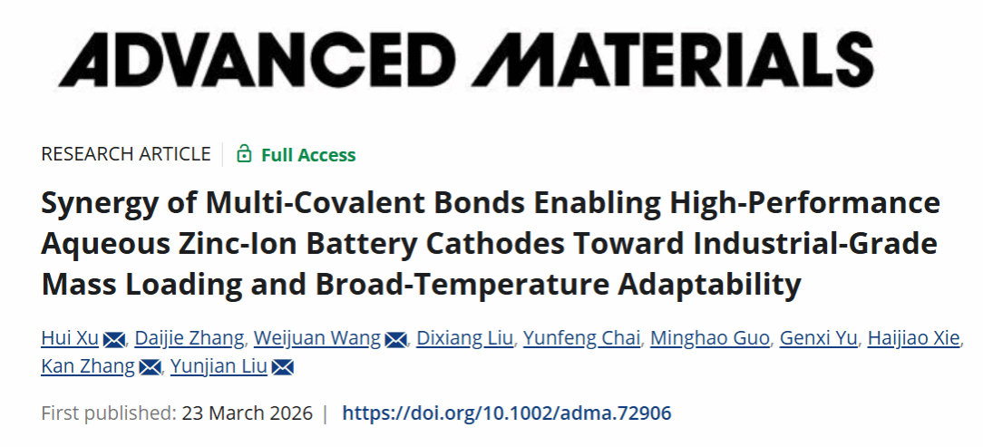 近日,材料学院师生在材料领域顶级期刊Advanced Materials上在线发表题为“Synergy of Multi-Covalent Bonds Enabling High-Performance Aqueous Zinc-Ion Battery Cathodes toward Industrial-Grade Mass Loading and Broad-Temperature Adaptability”的研究论文。beat365英国官网网站为论文的第一完成单位,材料学院刘云建教授和张侃教授为论文的通讯作者,徐晖为论文的第一作者。