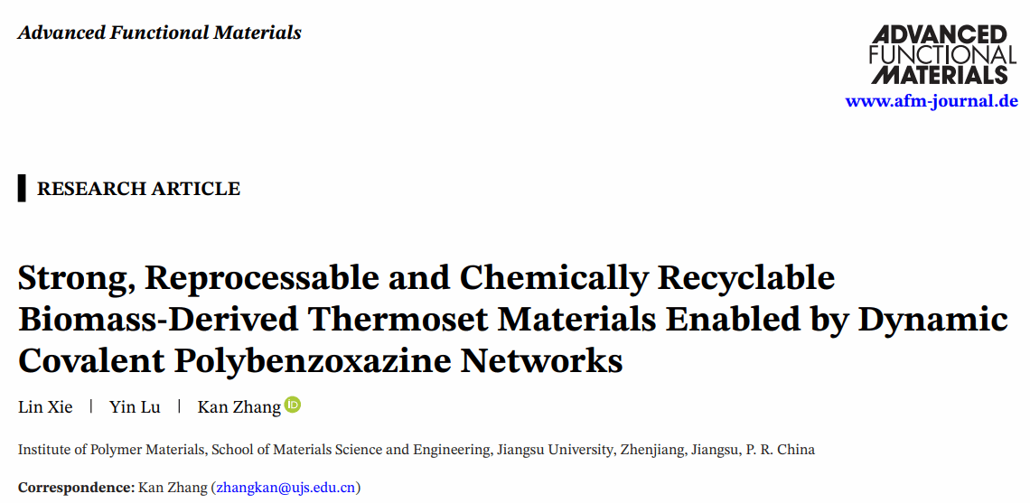 近日,材料科学与工程学院张侃教授课题组在国际材料顶级期刊Advanced Functional Materials在线发表题为Strong, Reprocessable and Chemically Recyclable Biomass-Derived Thermoset Materials Enabled by Dynamic Covalent Polybenzoxazine Networks的最新研究成果。beat365英国官网网站为论文唯一完成单位,材料科学与工程学院博士生谢琳为第一作者,张侃为论文通讯作者。
